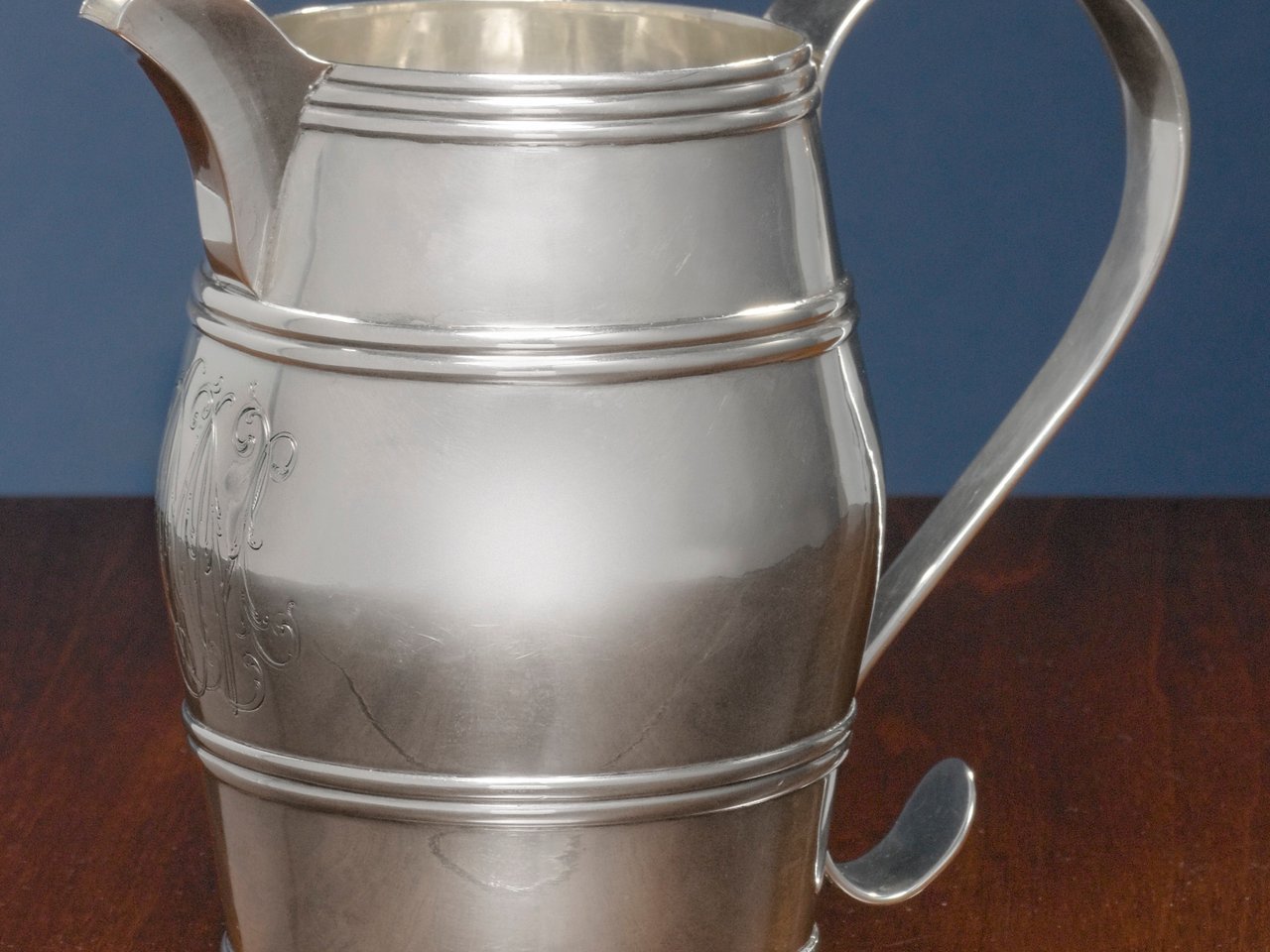 of barrel form applied with reeded baseband, girdles and rim, short angled spout, scroll strap handle, the front engraved withfoliate script monogram AMVC