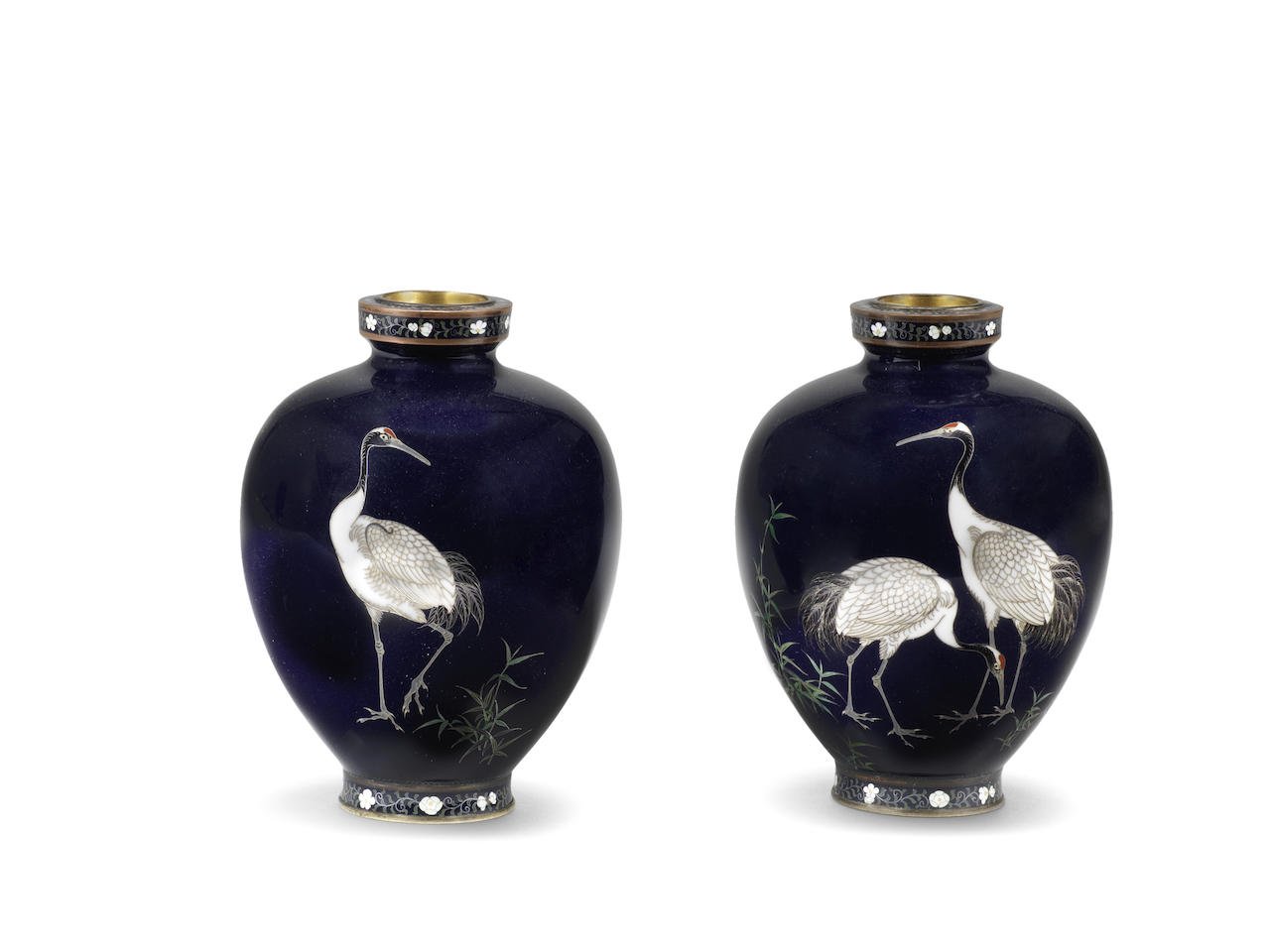 Each intricately worked in silver wire of varying gauge and forming a mirror i-image of the other, each with two red-crested cranes foraging for food beside stems of bamboo on one side and a solitary standing crane on the reverse, their feathers delicately worked in sculpted and tapered wire, all reserved on a midnight-blue ground; each vase applied with gilt metal rims and feet, the neck and foot with a narrow band of stylised sprays of white buds, each vase signed on the base Nagoya Hayashi saku with the stamped lozenge-seal of Hayashi Kodenji. (2).