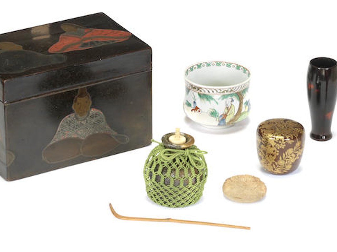 Comprising a wooden box and inrobuta (flush-fitting lid) decorated in coloured lacquers in a brown-black lacquer background with the Rokkasen (Six Poetic Immortals) depicted in the style of Ogata Korin (1655-1716) containing: natsume (tea caddy) decorated in gold hiramaki-e with autumn plants on a brown-lacquer background, the interior gold kinji lacquer, a wood kogo (incense box) carved in the form of a peony, a bamboo chasen (bamboo whisk) in a lacquer holder, a porcelain hibachi (brazier) decorated in overglaze enamels with seated Chinese scholars in a pine grove, a stoneware water bottle with ash glaze, gold lacquer repair and stopper covered in bamboo leaf and a chasahku (a bamboo tea scoop), the box, natsume, hibachi and water-bottle all with silk brocade bags, accompanied by a sheet of paper inscribed 光琳六歌仙蒔絵茶函銘五福 Korin Rokkasen maki-e chabako mei Gofuku (Tea box with Six Poetic Immortals by Korin, named Gofuku [Five Happinesses]); with lacquered wood outer storage box.(15)