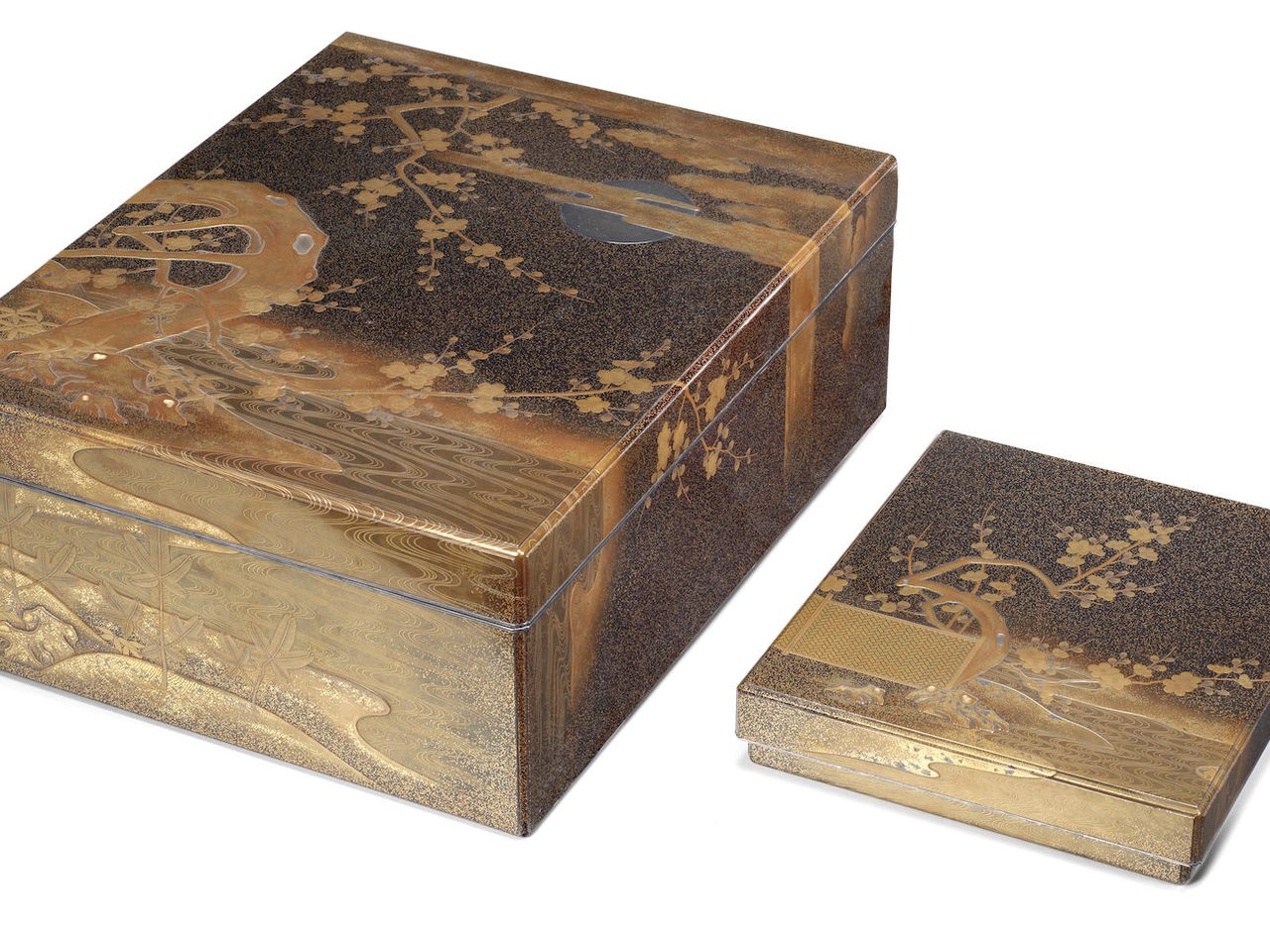 Of standard rectangular form with rounded chiri-i (edges) and inrobuta (flush-fitting lids), entirely covered in black lacquer and decorated mainly in gold, silver, and coloured hiramaki-e and takamaki-e, with gold hirame, kinpun, and nashiji and silver sheet; depicting on the lid of the suzuribako a blossoming plum tree next to a garden fence by a stream, on the reverse of the lid three overlapping shikishi (square sheets of decorated paper), the uppermost sheet with autumn plants including hagi (bush clover, Lespedeza bicolor) and susuki (plume grass, Miscanthus sinensis), the middle sheet with dyed-paper designs, the lowest sheet with characters from poem 219 from the tenth-century Kokinwakashu anthology (see below), the interior of the box of dense gold nashiji, fitted with a complete set of writing utensils finished in gold nashiji and silver, a partially gold-lacquered suzuri (ink stone) and a silver suiteki (water-dropper) in the form of two plum blossoms; the exterior of the ryoshibako with a blossoming plum tree by a stream, the moon, and clouds, the reverse of the lid with three tanzaku (long rectangular sheets of decorated paper) inscribed with poems 40, 90, and 243 from the Kokinwakashu anthology (see below); silver rims; the other surfaces gold nashiji; each unsigned; each with a lacquered-wood inscribed storage box. (13).