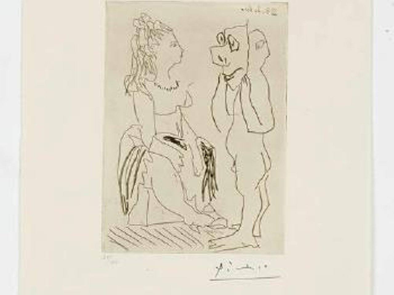 Homme debout avec masque devant femme assise by Pablo Picasso