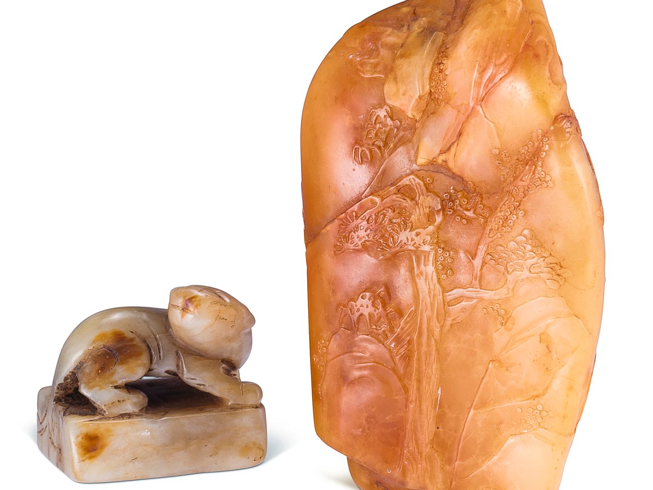 the jade seal with a finial worked in the form of a mythical beast detailed with a bifurcated tail; the soapstone seal carved around in low relief with a landscape of trees and rockwork