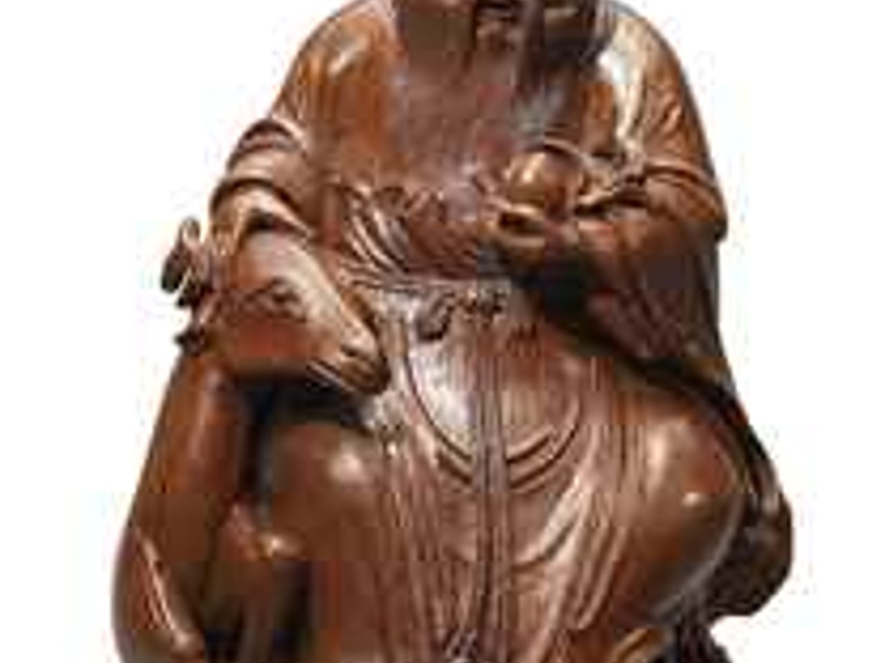 The bamboo is well carved in the round as Shoulao seated on a rocky boulder, clutching a fruiting peach branch in the left hand and the other hand patting the head of a recumbent deer, the large bald head with a characteristic protuberance, his mouth agape to provide a smiling expression.