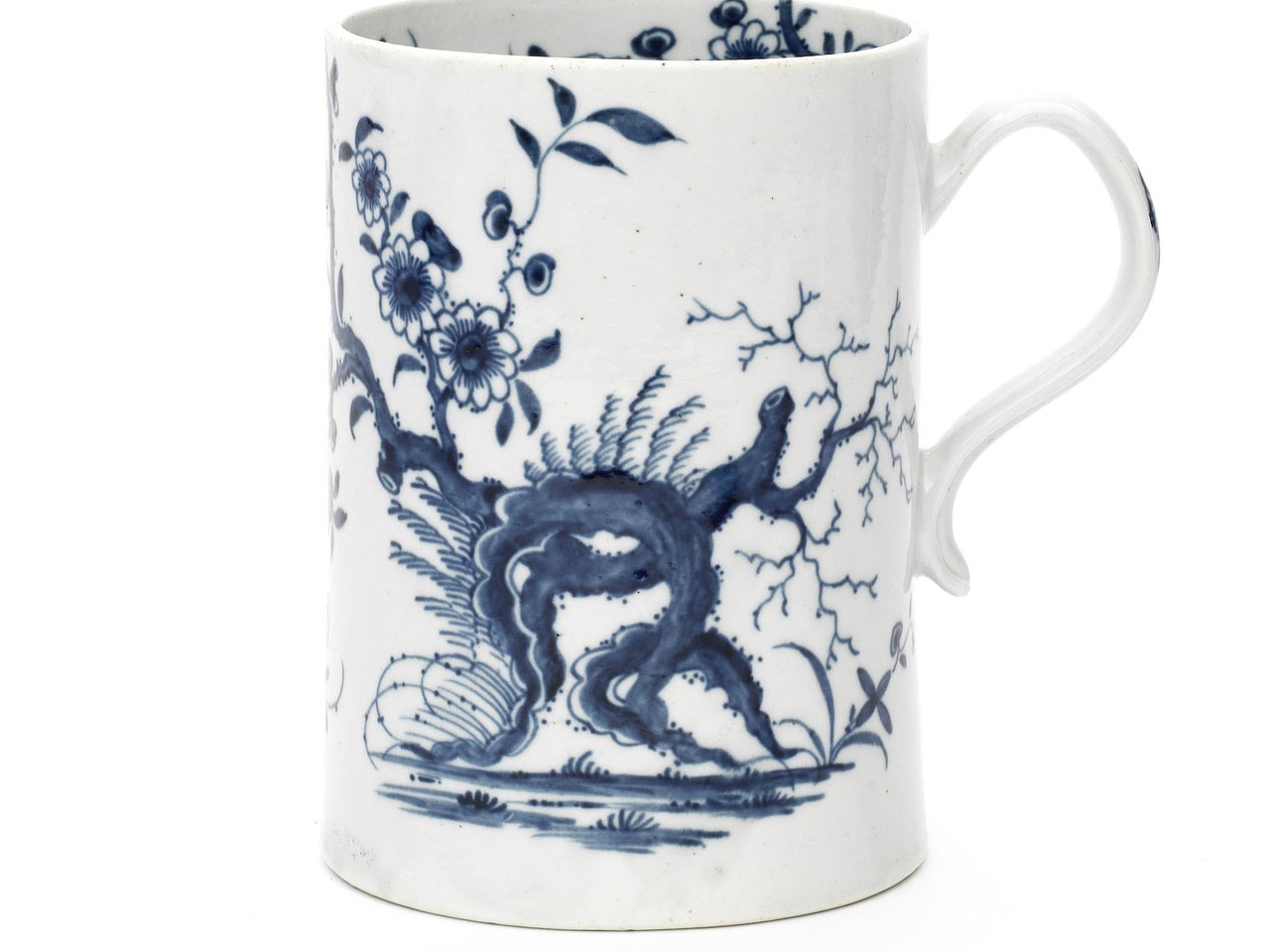 Cylindrical with a slightly spreading base and grooved strap handle, painted in dark blue with the 'Prunus Root' pattern, the flowering branches continuing into the interior rim, workman's mark