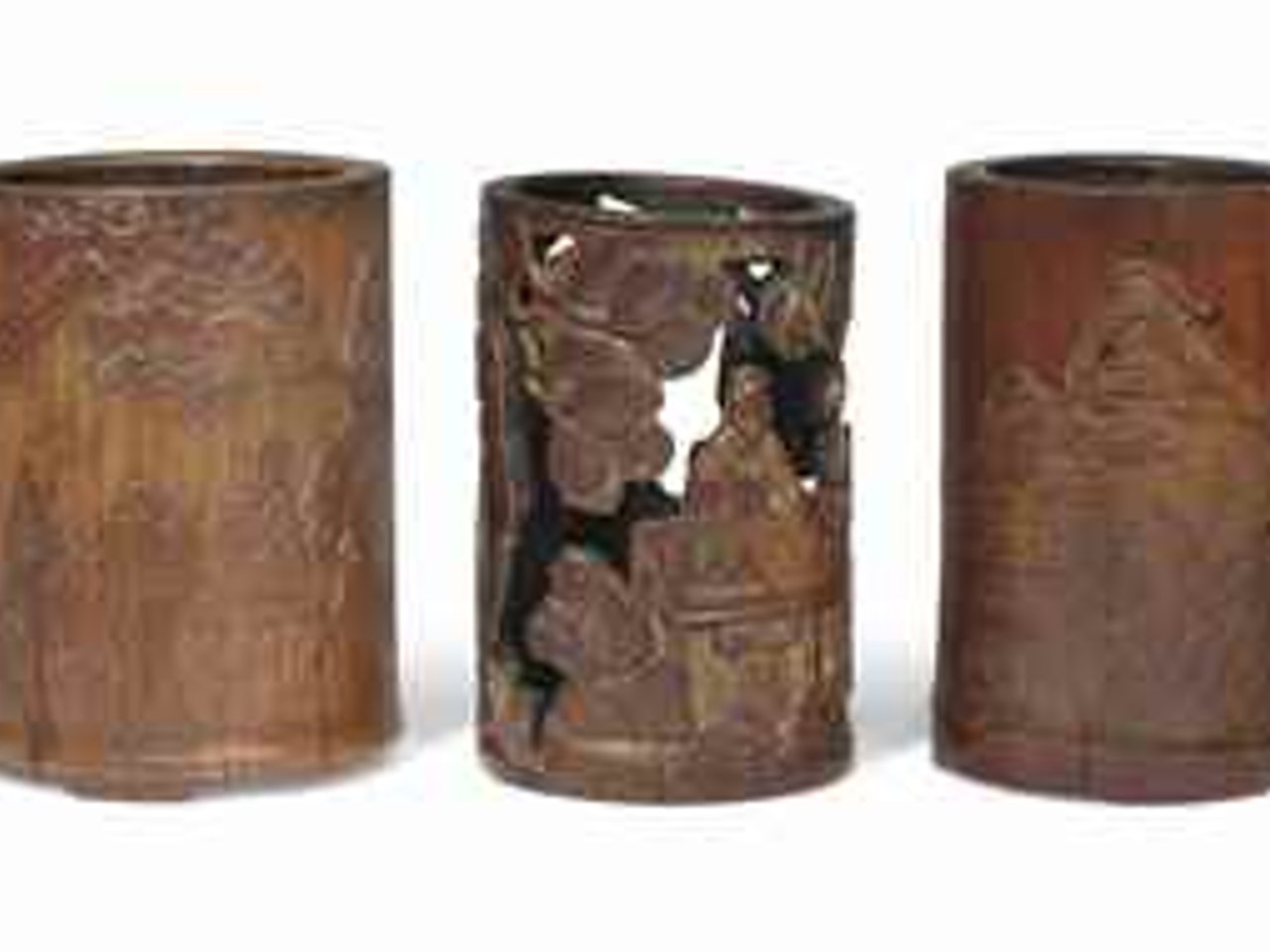The group comprises: a brush pot carved with scholars drinking wine under a pine tree; a reticulated brush pot carved with a scholar and attendants beside a pine tree and crane in flight; and a brush pot carved in low relief with a mountainous landscape.