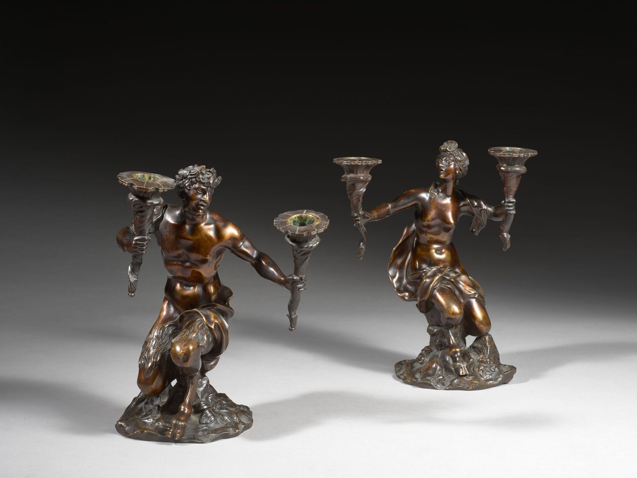 En bronze à patine brune, à deux lumières, représentant un couple de faunes, reposant sur une terrasse rocaille