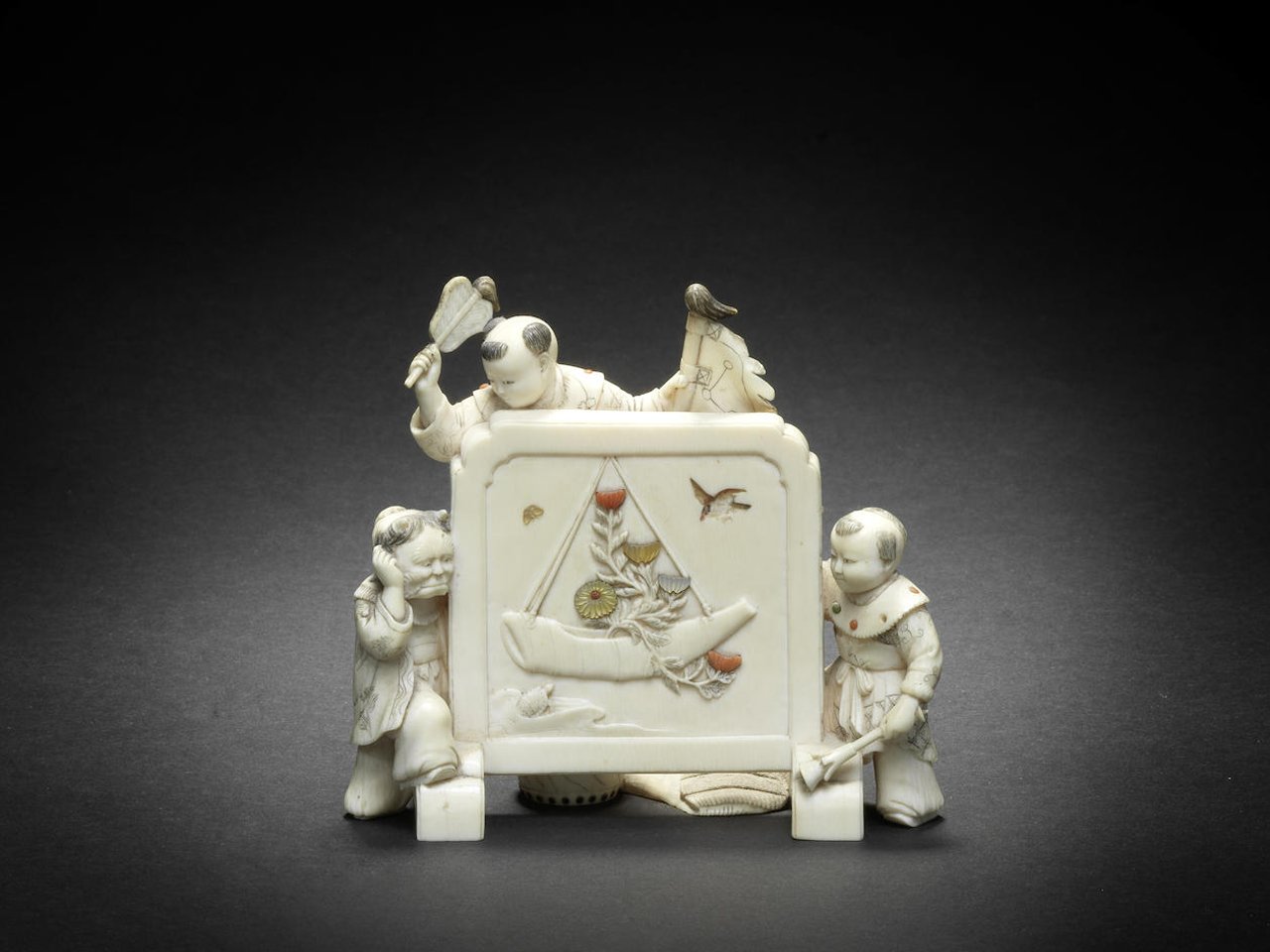 An ivory okimono group of three Karako (Chinese boys) cavorting around a floor screen by Anonymous