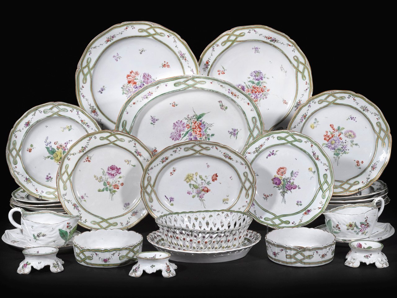 painted with flower sprays and small sprigs, the gilt-edged shaped-rims decorated with striped green and gilded interlaced ribbons, comprising: