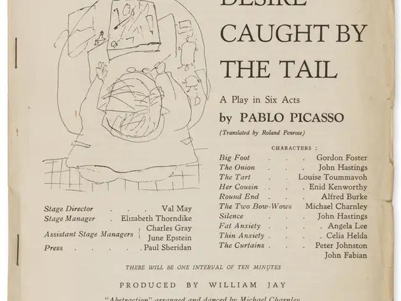 Picasso (Pablo).- Programme for "Desire Caught by the Tail": A Play in Six Acts by Pablo Picasso, 6pp. duplicated typescript Foreword by Roland Penrose (the translator) stapled in printed wrappers with illustration by Picasso, vertical crease where previously folded, a little soiled and creased/frayed at edges, 4to, 1950.