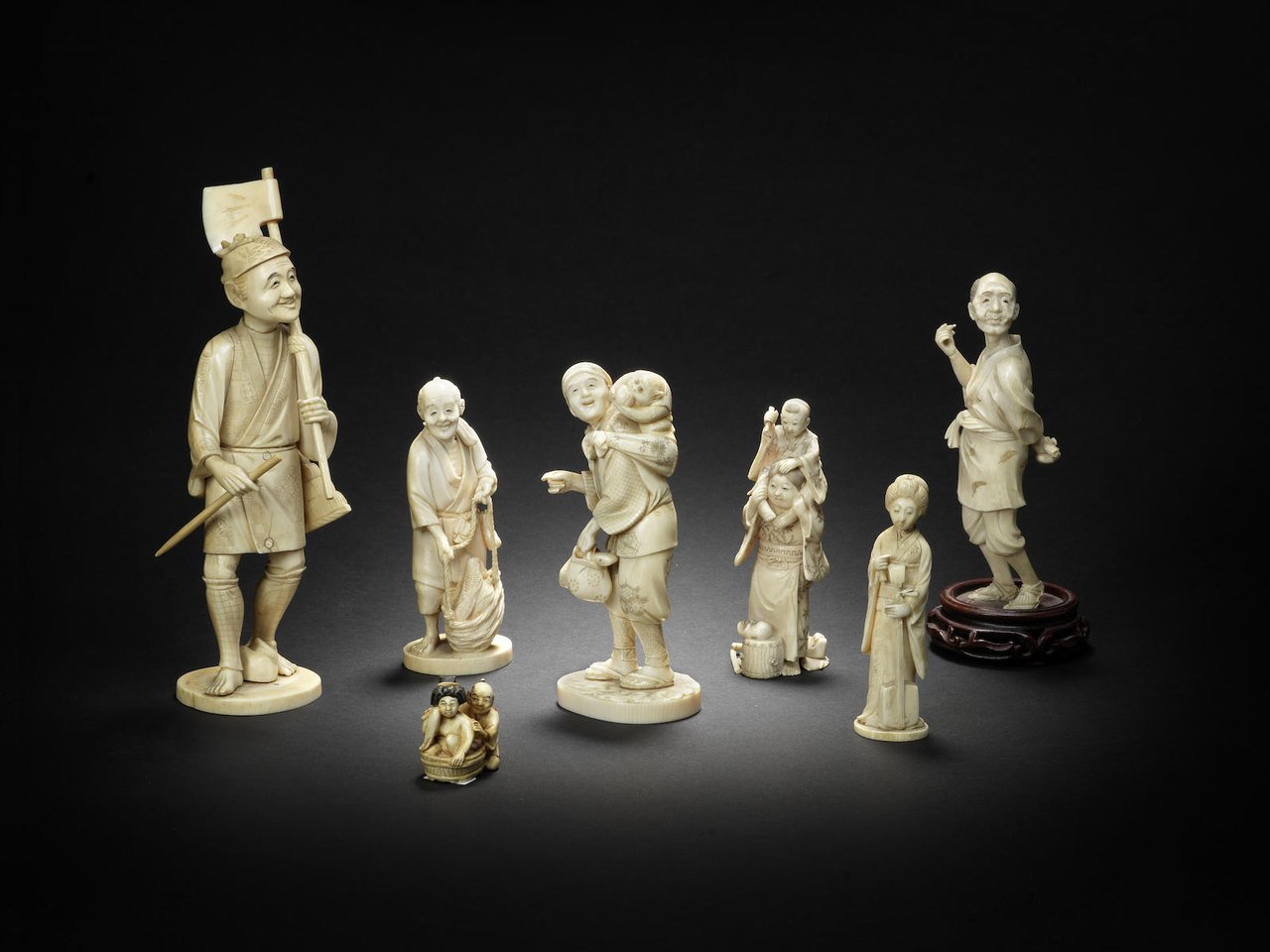 Comprising a monkey trainer, his performing pet on his shoulders biting into a persimmon, signed on the base in a red-lacquer reserve Toshimasa, 15.2cm (6in) high; the second a peasant holding basket filled with ripe corn, signed on the base within an oval reserve Toshitsugu, 13cm (5 1/8in); the third a woman carrying her son holding a baton on her shoulders, a drum and masks strewn on the ground at their feet, signed Chikanao, 12.7cm (5in) high; the fourth a man standing fixed to a wood stand with a pipe in his hand, a tobacco pouch and pipe case clutched behind his back, unsigned, 17.2cm (6¾in) high; the fifth a young woman holding a shamisen, signed Kogetsu, 11.5cm (4½in) high; the sixth a sectional ivory figure of a woodsman holding an axe over his shoulder, signed in a red-lacquer reserve Tamayuki, 23cm (9in) high; the seventh an okimono netsuke of a man bathing a woman in a shallow tub, signed Seigetsu, 4.1cm (1 9/16in) high. (7)