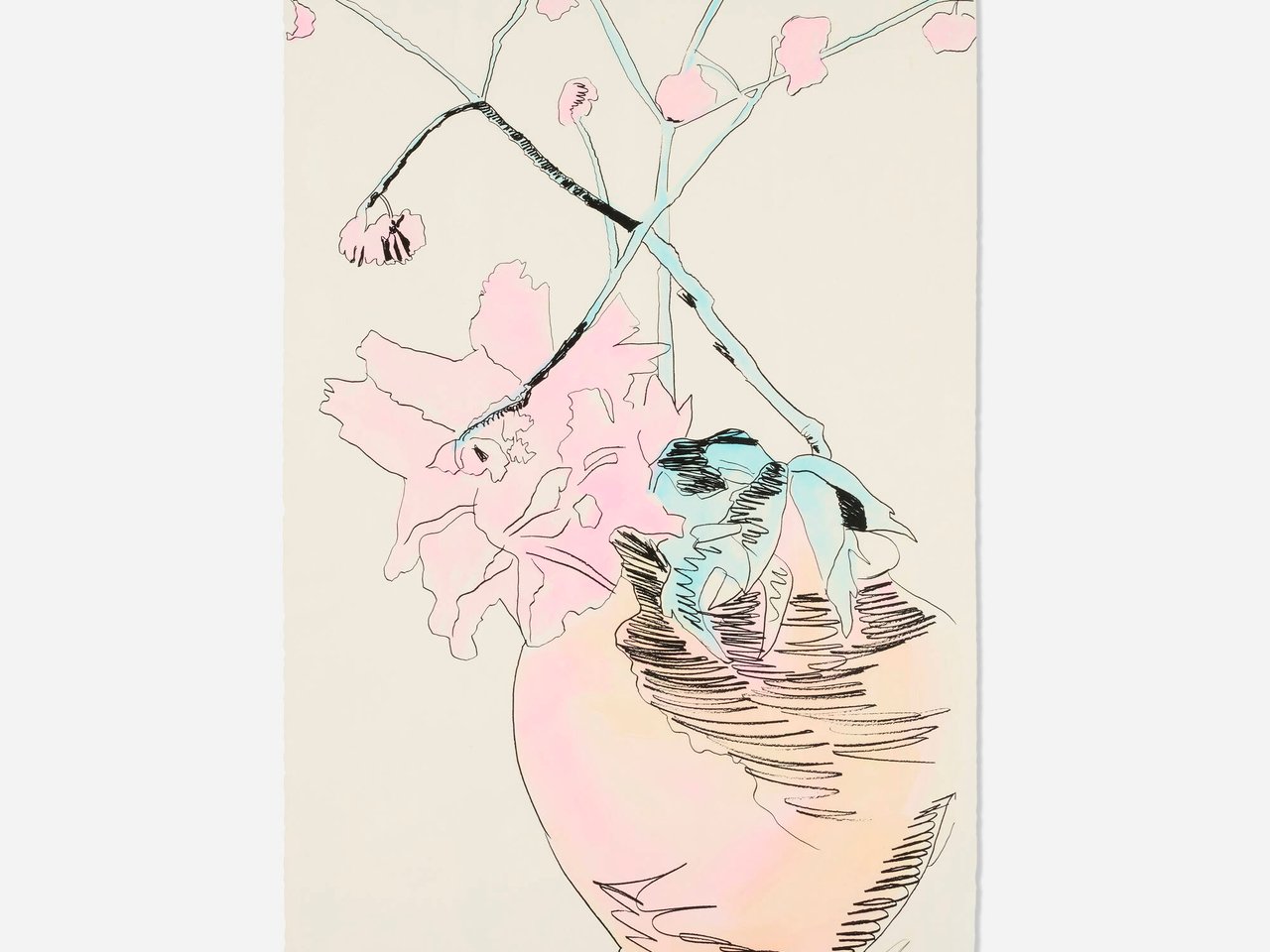Work is in good condition. Area of discoloration to lower right edge. Pigment within flower pot is discolored (faded?), otherwise, work presents well. Framed behind acrylic measuring 46 x 33 inches.