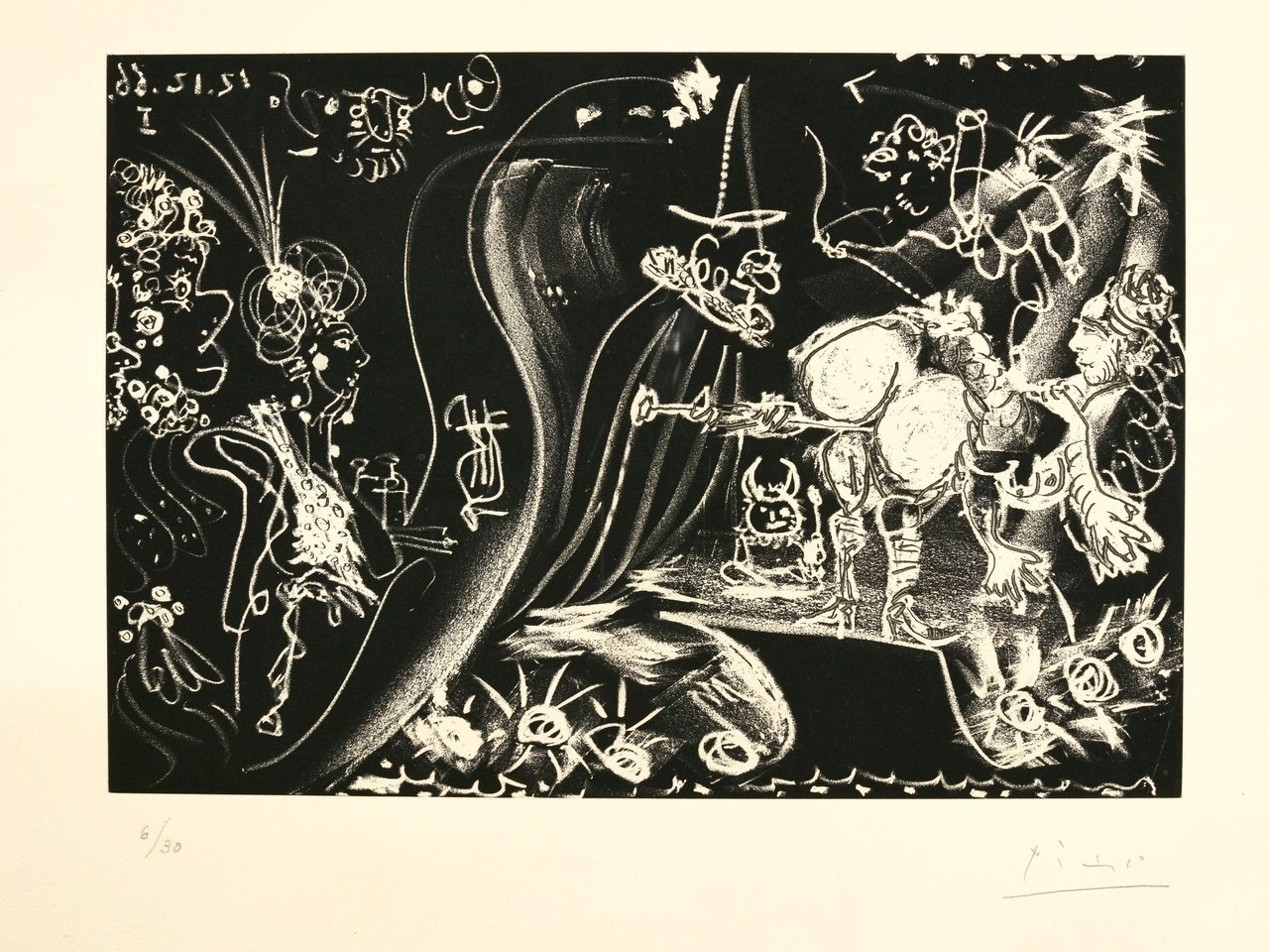 AU THÉÂTRE: LE CLYSTÈRE; AND LE COCU ASSISTANT À LA COMPARUTION, DEVANT L'INQUISITION, D'UNE FEMME NUE ENCHAÎNÉE PAR UN BOURREAU (B. 1249, 1252; BA. 1437, 1440) by Pablo Picasso