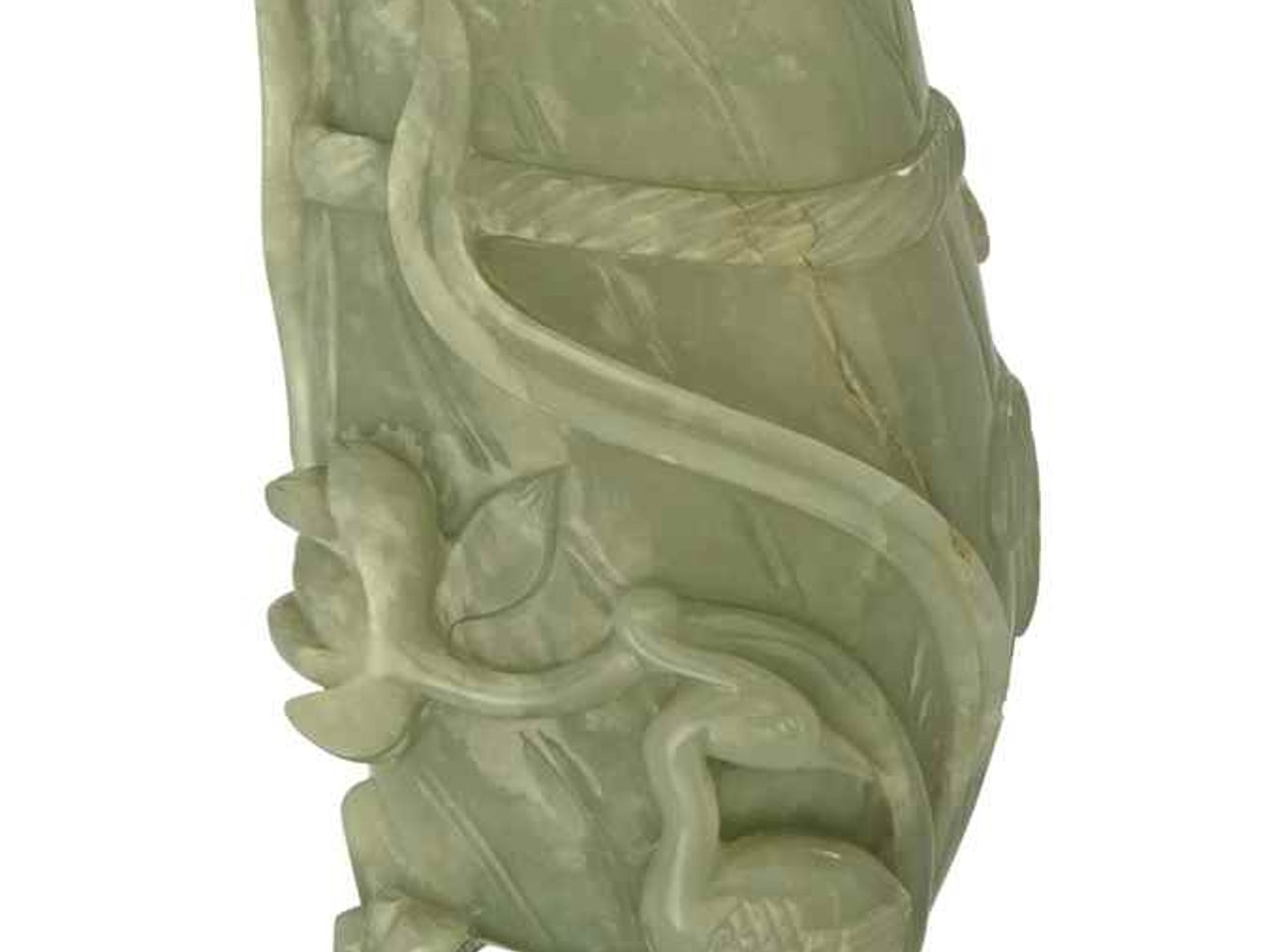 The vase is carved and pierced in the form of a large beribboned lotus leaf, its foot formed by a long trailing stalk, a flower and crane to one side. The stone is of a greyish-celadon tone with some veins and creamy white flecks.