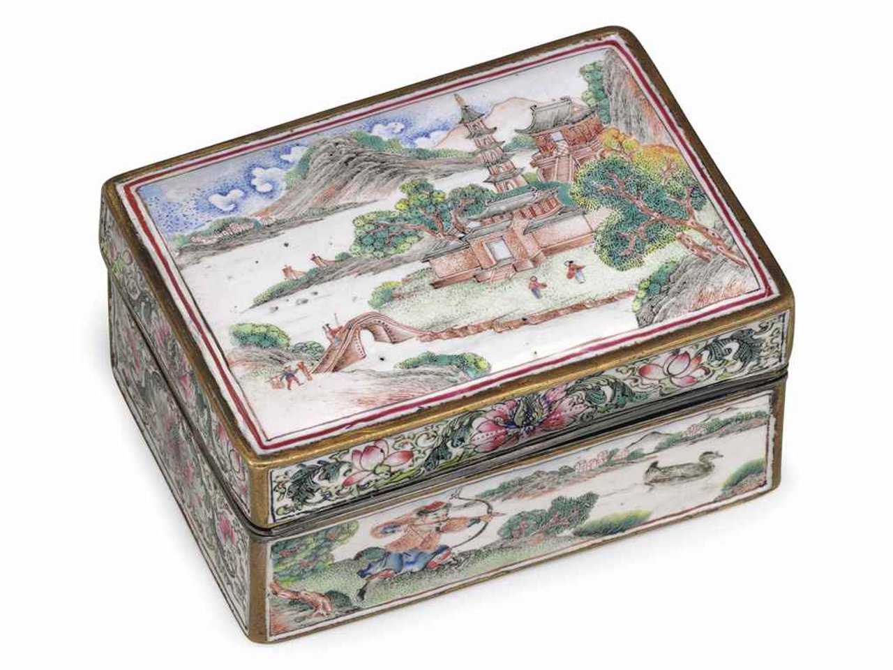 The sides with finely painted scenes of Chinese duck hunting and floral tracery