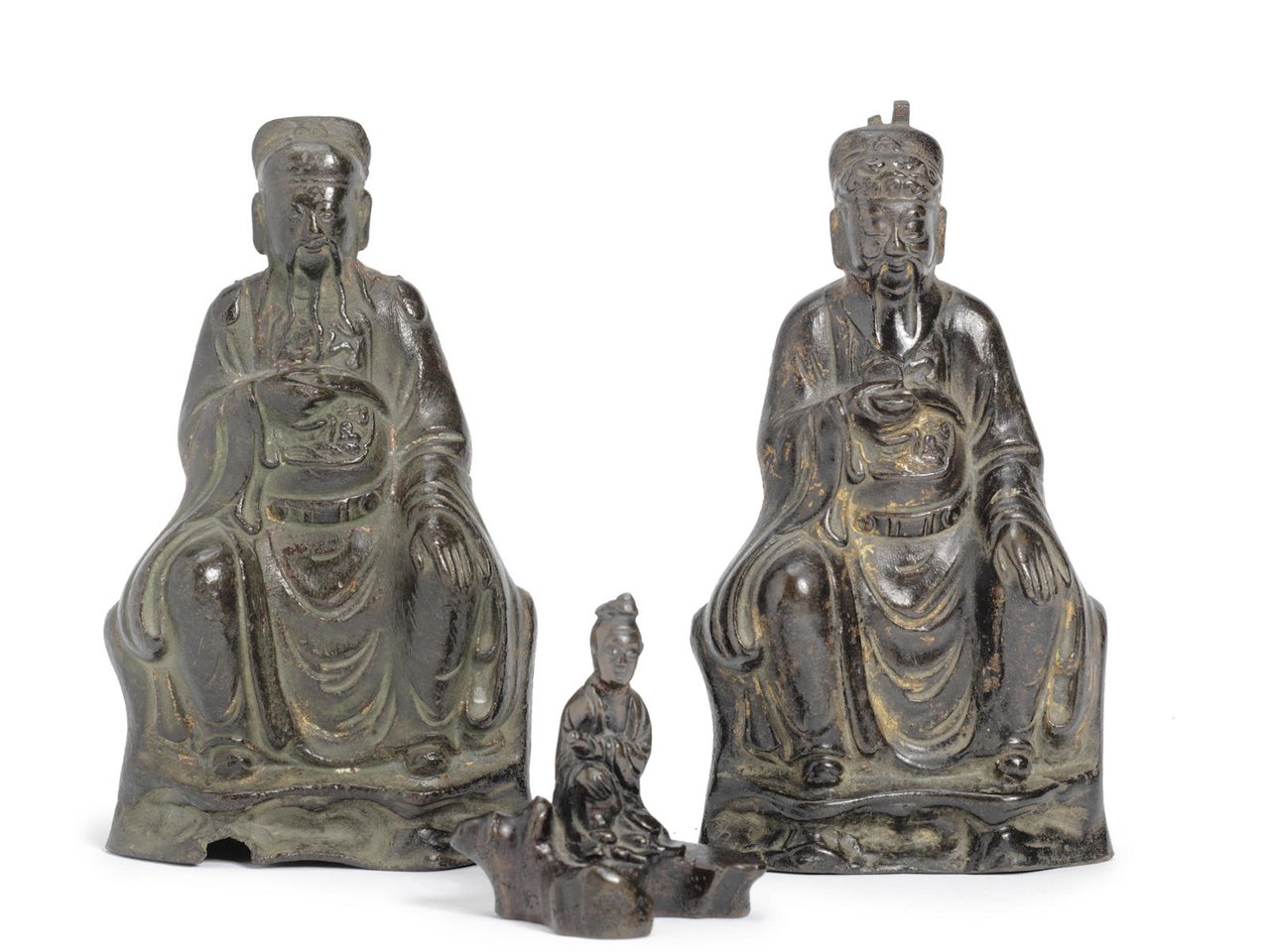 Two bronze figures of Daoist deities and a bronze scrollweight by Anonymous