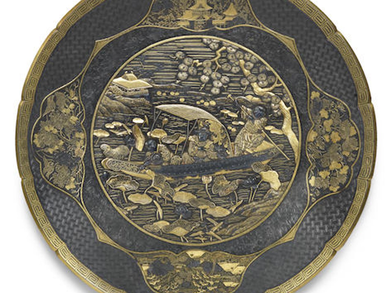 Inset with a central gold-outlined panel depicting three karako (Chinese children) parodying a Korean boating trip across a lotus pond, predominately worked in chiselled relief of copper, gilt and shibuichi with details of gold overlay, one child ferrying his two companions, surrounded by four petal-shaped panels enclosing views of thatched huts and shrines alternating with bird-and-flower scenes, reserved on a ground of rinzu (textile-weave design) inlaid in silver overlay within an outer geometric border; signed in gold on the base within a square cartouche Kyoto Moriguchi.