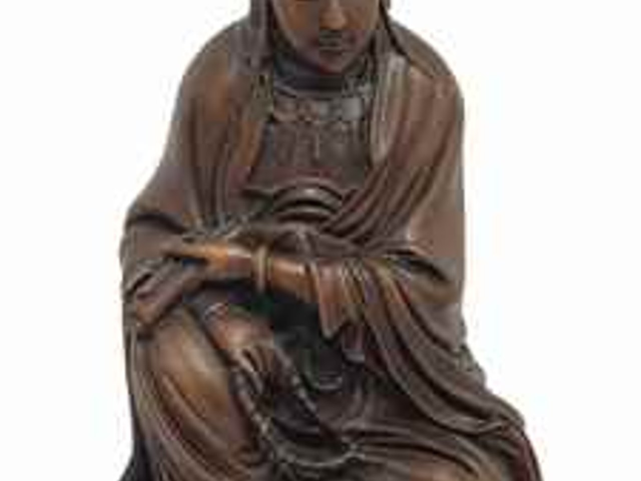 The deity is carved with downcast eyes<br/> her hair upswept into a top knot. Her belted robes fall about her body in loose folds and are open at the chest to reveal a necklace. She carries a scroll in her left hand and rosary beads in her right.