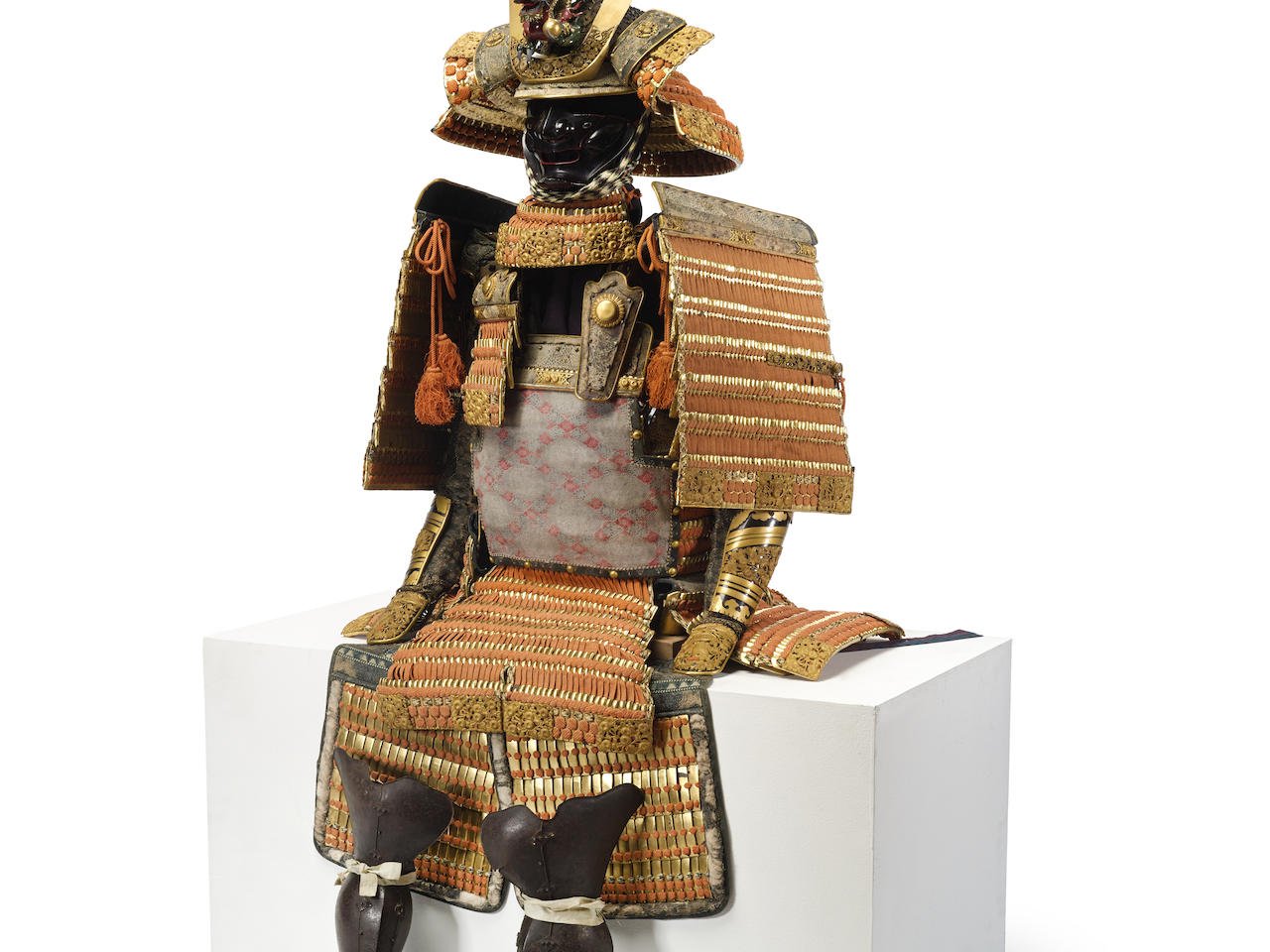 The components lacquered gold, laced in orange and mounted with gold kanamono pierce-carved with chrysanthemums, the armor comprising a koboshi kabuto dressed in nihojiro style with the front and rear cover plates pierced with chrysanthemums and the shinodare finished in nanakoji and standing rivets, the kuwagata-dai also pierce-carved with chrysanthemums and supporting large gilt-metal kuwagata and an impressive dragon maedate lacquered green, gold and red, the o-manju-jikoro ending in large fukigaeshi with stenciled leather, fusegumi, fukurin and chrysanthemum family crests; the black-lacquer nerikawa menpo with standing flanges on the cheeks and fitted with a three-lame yodarekake; the front of the hon-kozane do applied with stenciled leather with Chinese lions within diamond-shaped reserves, fitted with four sections of five-lame kusazari, each of the lowest lames separated into two sections; o-sode;kyubi-no-ita and sendan-no-ita decorated en suite to the do Yoshitsune gote with plates decorated in gold and black-lacquer and with elaborate gilt-copper covers on the forearm and tekko pierce carved with chrysanthemum and a butterfly over a stream with floating chrysanthemum heads; kawara haidate; russet-iron tsubo suneate; boar-bristle boots