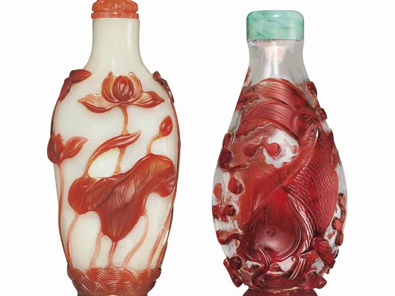 The first, 1770-1860, is carved through the clear red glass overlay to the translucent white ground with lotus and water plants. The second, 1760-1850, is decorated with two carp amidst water weeds, carved through the clear red glass overlay to the clear ground.