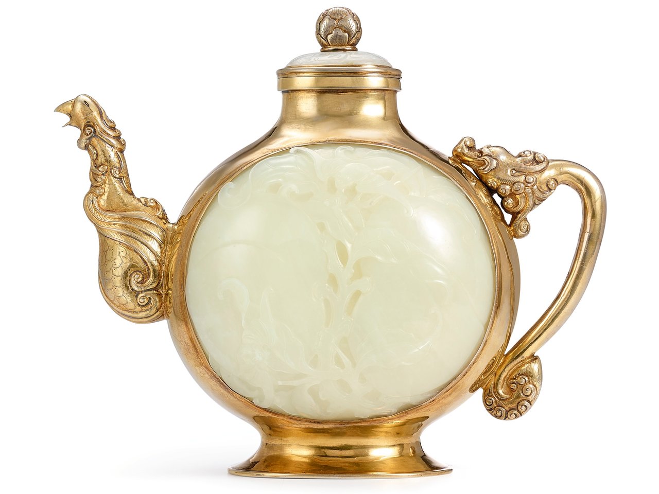 modelled with a circular body of flattened form, supported on a splayed foot and surmounted by a tapering neck and galleried mouth-rim, flanked by a handle modelled in the form of a dragon's head at the top and ending with an upturned tail, opposite a spout cast as a phoenix with its beak forming the aperture and plumage elaborately rendered in scrollwork, each main side of the vessel inset with a convex oval white jade panel, one side worked in low relief with two large peaches borne on gnarled leafy branches and further rendered with two bats, the other similarly rendered with a partially concealed bat and a floral bloom issuing from a stem, the base with an apocryphal four-character Qianlong reign mark, the oval cover similarly inset with a pierced white jade panel adorned with a pair of kui dragons, encircling a gilt finial cast covered with petal motifs