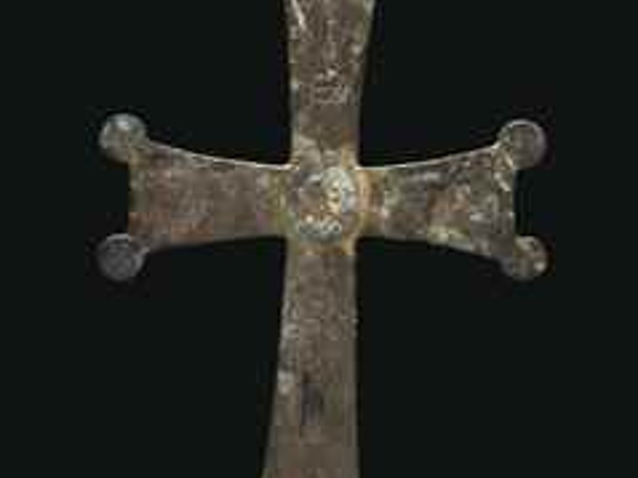 Solid cast, the flaring arms terminating in circular knobs at each corner, adorned on both sides with deeply-incised motifs and identifying Greek inscriptions, with partially-preserved silver inlay; the obverse with the remains of a now-missing medallion soldered at the center, the upper arm with the Virgin Mary carrying the infant Christ, standing on a pedestal, flanked by the inscription, "the Holy Theotokos;" the horizontal arms with kneeling draped angels, their hands raised in veneration towards the now-missing central medallion (likely once-depicting Christ), flanked by bust medallions of the Evangelists, St. Peter to the left, St. Paul to the right, as identified by inscriptions; the lower arm with a standing St. Nicholas flanked by identifying inscription, a bust medallion with St. Theodore below; a rosette on each circular knob; the reverse with the Crucifixion as related in the Gospel of John 19.26-27 at the center, Christ wearing a tunic, his feet resting on a suppedaneum, a tabula with Christ's abbreviated name above, the inscriptions below from the gospel in which Christ tells Mary, "Behold your son!" and her companion, "Behold your mother!"; a medallion bust of an Evangelist on the end of each arm, including (from top moving clockwise) St. Matthew, St. John, St. Mark and St. Luke; a bust on each circular knob, with saints on the vertical arms and archangels on the horizontal ones; a tenon below