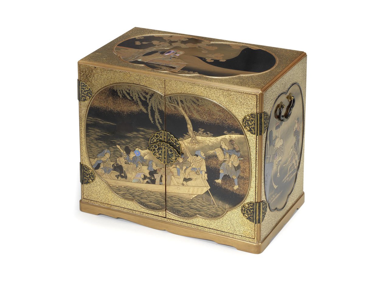 Of convention form, raised on an integral scalloped base, the exterior inset with five-lobed silver and gold edged panels, each framing a different scene, elaborately decorated all over in gold, silver and polychrome takamaki-e, hiramaki-e, e-nashiji and kirikane, the top depicting the classic scene of Rosei (in Chinese Lu Sheng), reclining upon a low bed, his face visible through the tanslucent shell fan with which he shades himself, to the top right his grandiose dream of wealth and rank delicately lacquered in yamimaki-e with attendants carrying the Emperor resting in his palaquin, the front depicting a disparate group of travellers in a ferryboat, the left side with Kanzan and Jittoku extolling the contents of a long unfurled scroll, the right with a father and son on Boys' Day watching an itinerant entertainer performing in front of a banner painted with Shoki, the reverse showing stags grazing beside young pine saplings on a moonlit evening, the hinged double-doors opening to reveal a continuous scene embellished in predominantly gold takamaki-e with an idealised pananorama of pagodas, thatched dwellings and shrines nestled among pine-clad undulating hills and possibly the Uji Brige spanning the river, the design extending within to the six drawers decreasing in height towards the top, each drawer fitted with a metal knop, the sides applied with a shakudo ring handle, the front applied with silvered-metal mounts chased with karakusa ('Chinese grasses'), the inside of each drawer lined in purple silk and divided into three compartments for the storage of inro, unsigned; with a wood storage box. (2).