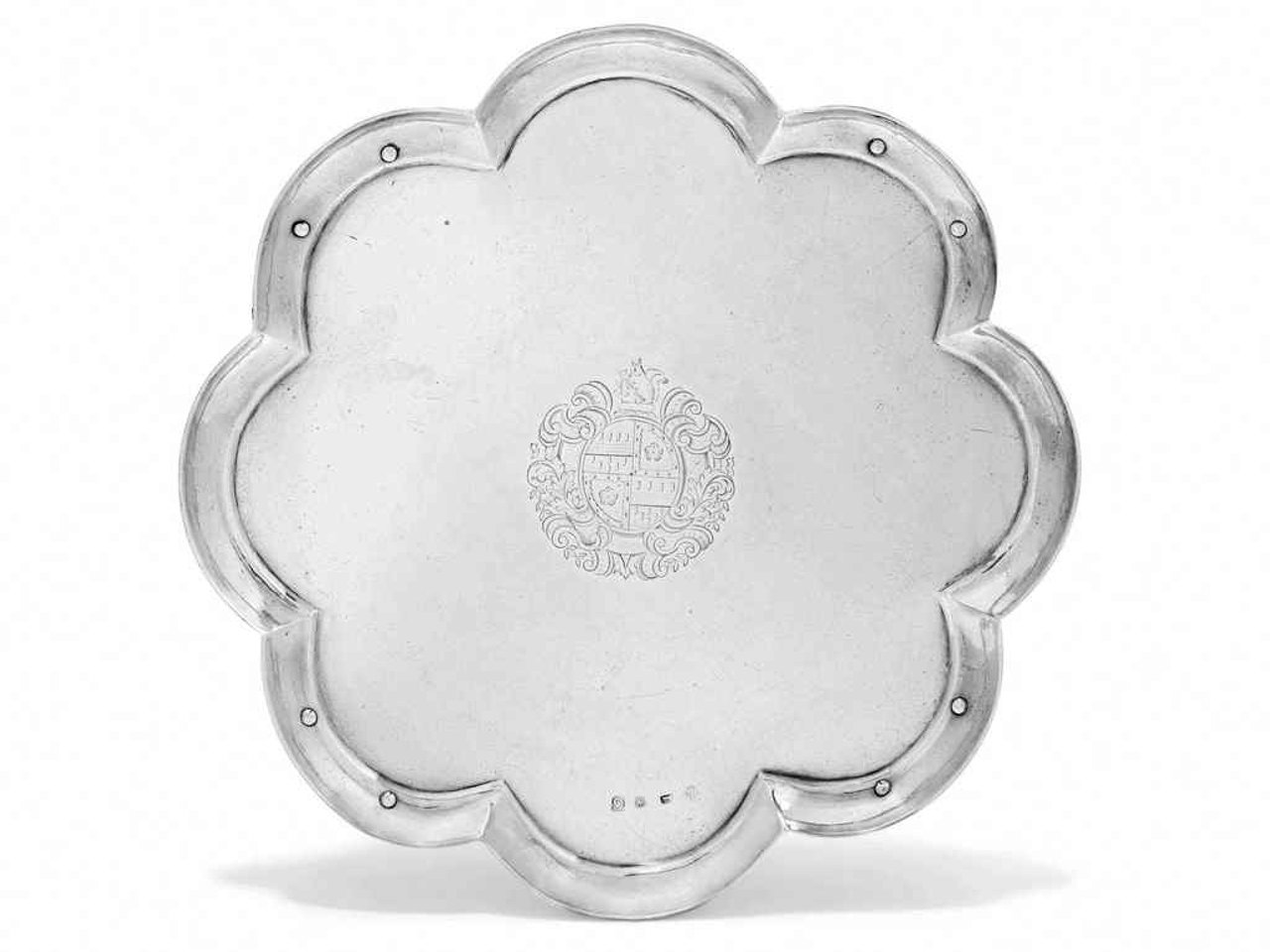 Octofoil and on four panel feet, engraved with a coat-of-arms, further engraved underneath with an inscription, marked near border