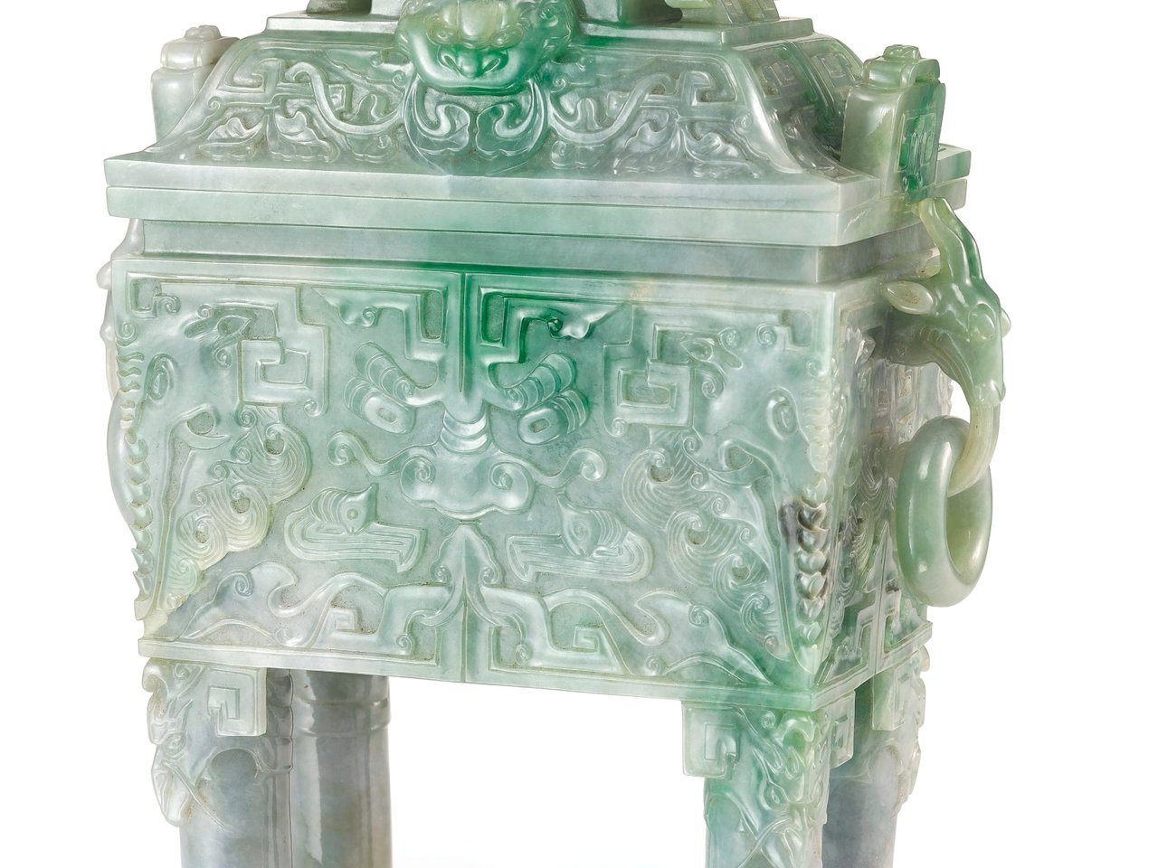 of archaic fangding form, the slightly tapered rectangular body rising to a constricted neck of corresponding form and a square-cut rim surmounted by a pair of openwork angular scroll handles, all supported on four mythical beast mask cylindrical legs, the rim surmounted by a pair of angular scroll handles, the sides decorated in low relief with archaistic mythical beast masks, interrupted by a pair of deer-like mythical beast mask handles on the shorter sides and suspending loose rings, the long sloping sides of the openwork cover decorated with low-relief leafy scrollwork, partially interrupted with a pair of mythical beast masks, the shorter ones with angular scrollwork, all below a stepped open-top finial bordered with two pairs of mythical beast masks, two diagonally suspending archaistic mock handles, the variegated apple-green stone with mottled with subtle grey inclusions