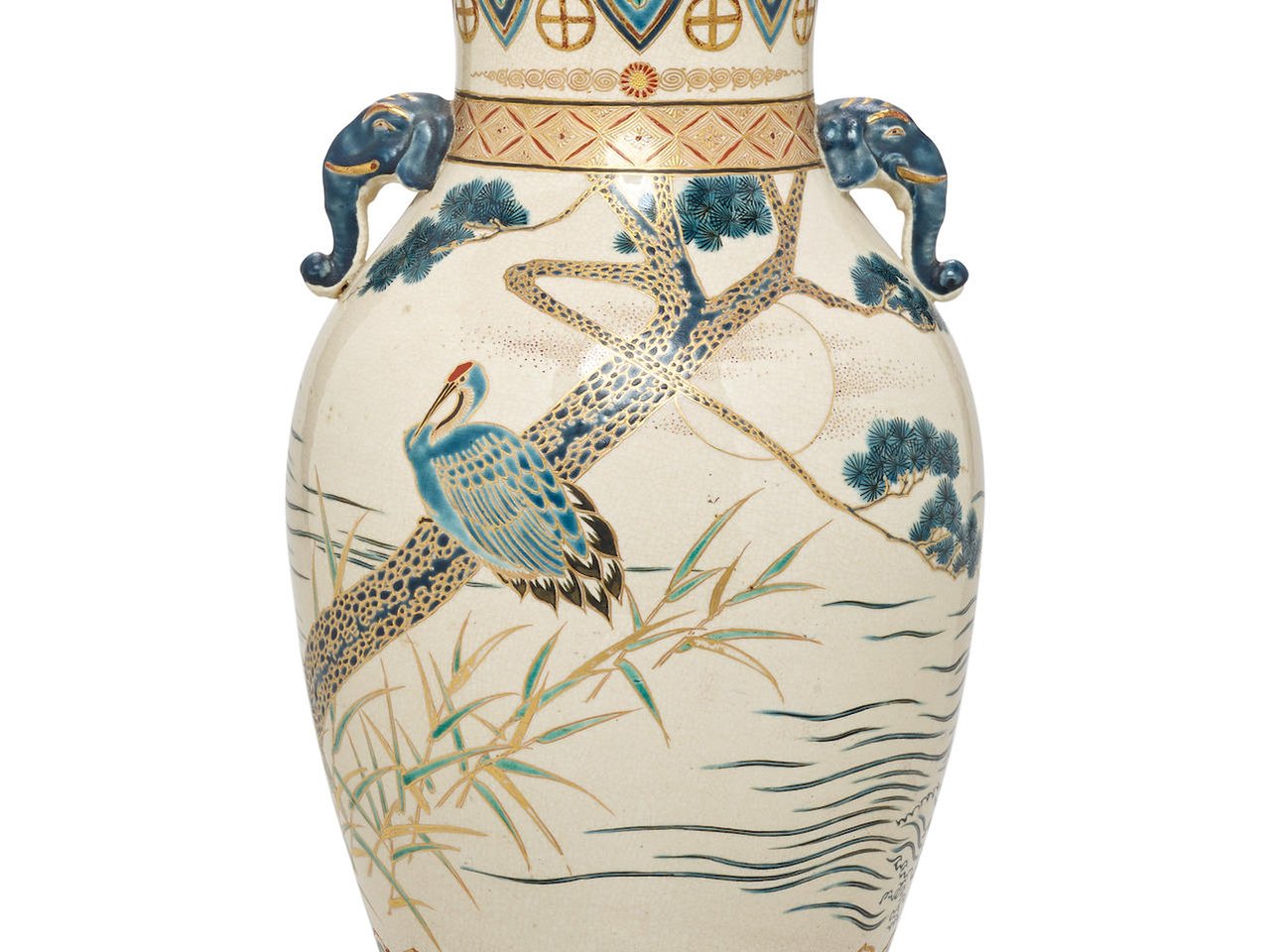 The first, a baluster vase applied with elephant handles and decorated in gosu blue, green, red and black enamels and gilt with cranes in a marsh by a pine tree, signed on the underside Satsuma-yaki under the mark of the Shimazu family; the second of kinuta (mallet) shape and decorated with stands of blossoming flowers, the shoulder painted with chrysanthemum lappets and the neck with a stiff petal collar above a geometric band