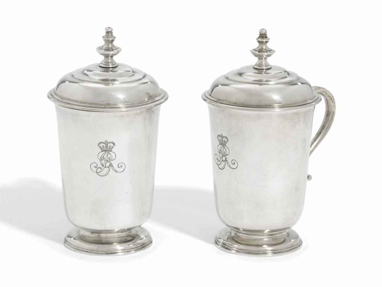A PAIR OF GERMAN ROYAL SILVER BEER-MUGS AND COVERS by Anonymous