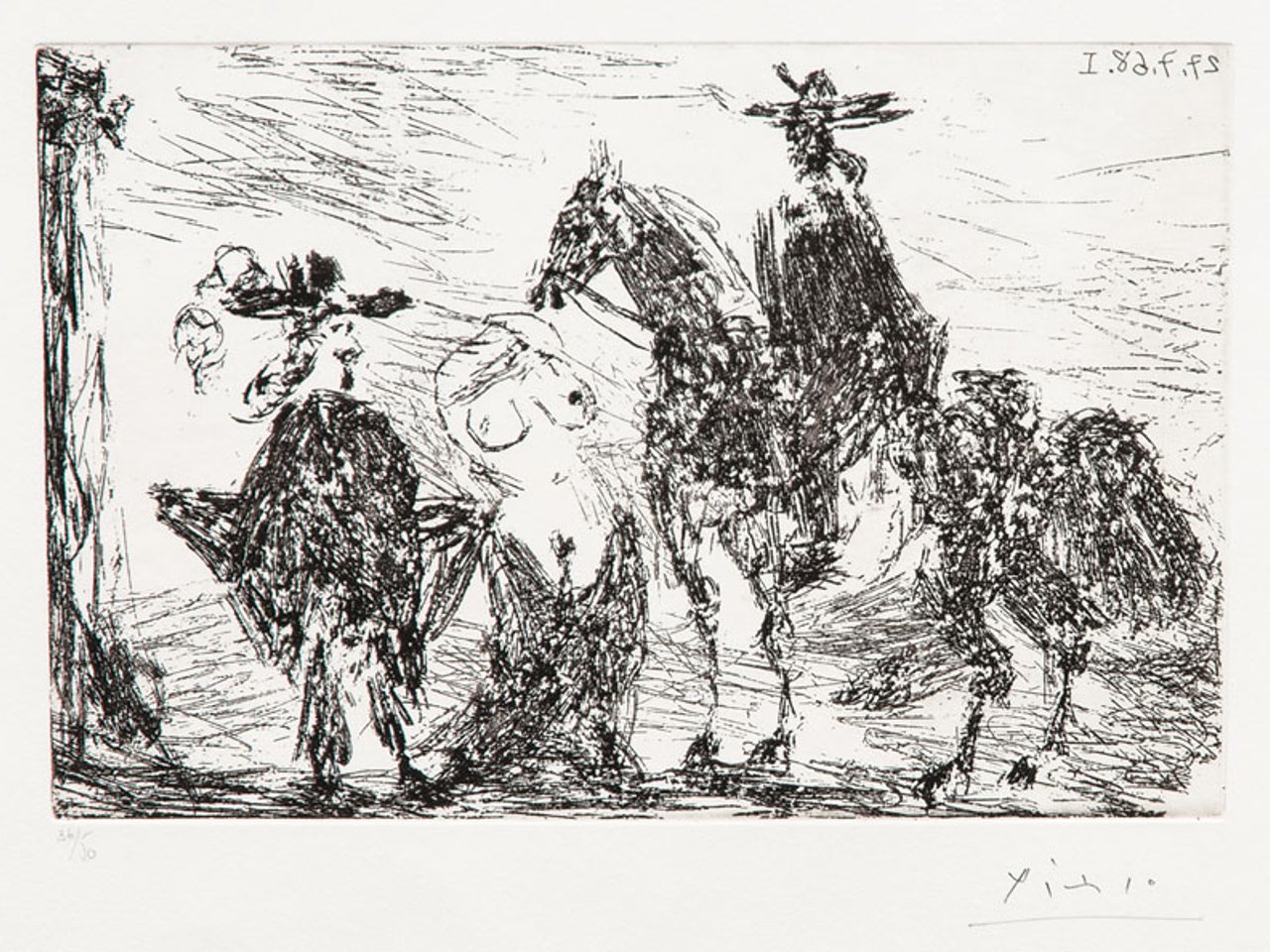 Etching, 14.7 x 22.2 cm, r. and signed in pencil. Picasso, l. and number 36/50, r. o. in the plate reversed dated 27.7.68.I, framed under glass. - WVZ: Bloch 1699. - From the series La Célestine. The 66 sheets of the series “La Célestine” were also created within Suite 347. This was published in an unsigned book edition, but also, like Suite 347, in a small edition of 50 signed and numbered prints. In Célestine, Picasso illustrates a Spanish literary classic from the 16th century, which deals with the tragic love story of the nobleman Calisto and the commoner"s daughter Melibea. Since she initially rejects his love, Calisto turns to the matchmaker Célestine, who, together with her accomplices, wants to squeeze as much money as possible out of the unlucky lover. The story ends with the tragic death of everyone involved. - Universal genius, one of the most important artists in art history, who has made groundbreaking achievements in almost all artistic genres, in the most important collections around the world.