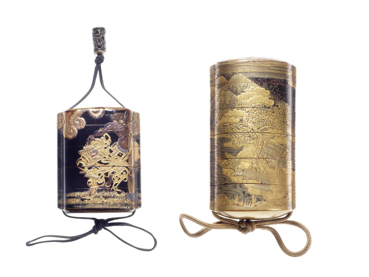 The first of four cases, the polished black-lacquer ground lacquered in takamaki-e with Mitsunaka attacked by a demon in a tree, his horse rearing on the reverse, with details of kirikane, unsigned, 6.4cm (2½in) high, with a pierced metal ojime; the second of five cases, embellished in gold hiramaki-e and takamaki-e with an elaborate continuous landscape of huts among cherry and pine trees, the details of kirikane, unsigned, 9.8cm (3 7/8in) high; the third of red lacquer, three cases, carved in relief on both sides with a shaped panel surrounding chrysanthemums and rocks, reserved on a ground of formalised motifs, the top and base similarly carved with a rolled scroll, unsigned, 8.2cm (3¼in) high, with a carved walnut ojime; the fourth of red lacquer and two cases, carved in relief with sages conversing and playing go in a garden, unsigned, 8.9cm (3½in) wide, with a part red-lacquer manju netsuke carved with karako (Chinese boys) and a crystal ojime; the fifth of wood, circular with two cases, carved in relief on both sides with formalised flowerheads and scrolling foliage, the edges carved with key fret, unsigned, 7.2cm (2 7/8in) diam.; the sixth wood with a single case, carved in relief with two panels of dragons, unsigned, 8.1cm (1¼in) wide; the seventh of bamboo and two cases, carved in relief with cranes in flight amid clouds and above seigaiha (stylised waves), signed Chikusen to, 7.5cm (3in) high. (7)