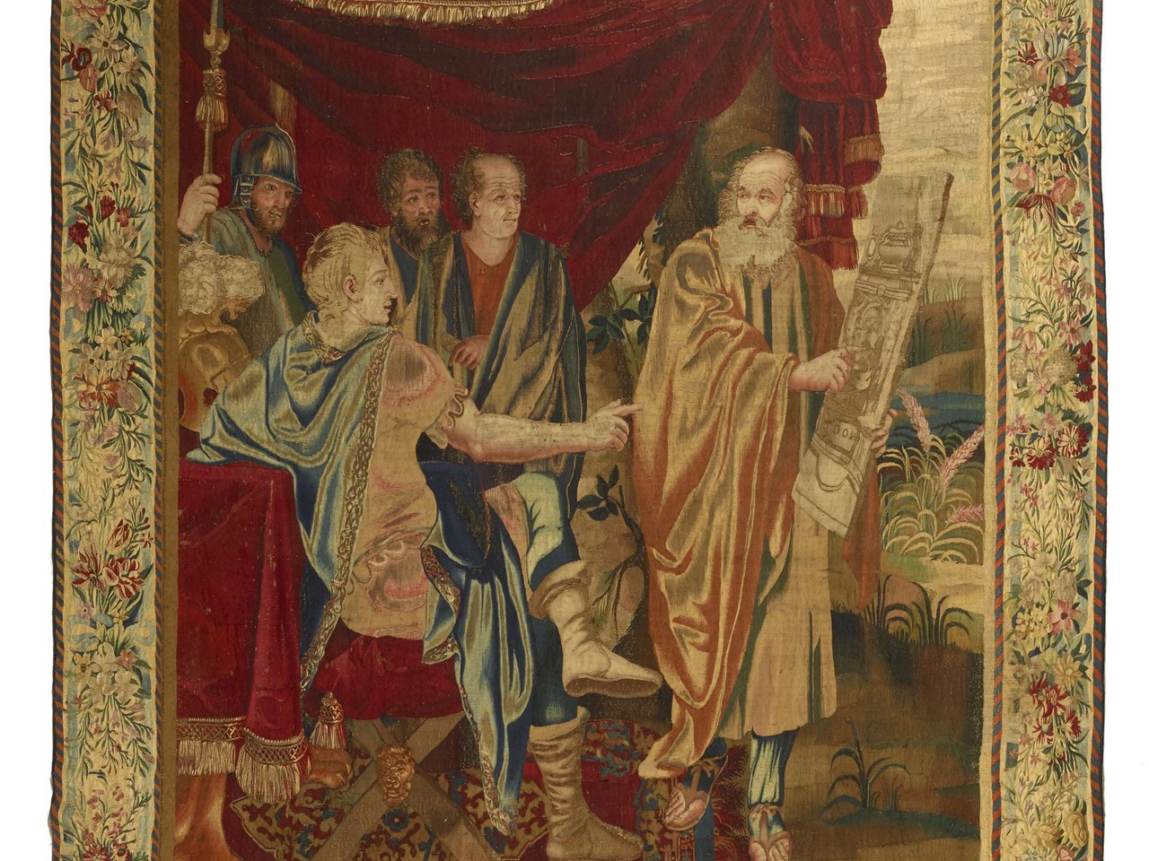 En laine, soie et fils de métal, représentant Tancrède assis sur un pliant entouré de ses conseillers, un architecte sur sa droite lui montrant le projet destiné au tombeau pour Clorinde, la bordure à décor de rinceaux fleuris au naturel et rubans bleus ; restaurations d'usage, réduite en hauteur, les bordures modifiées