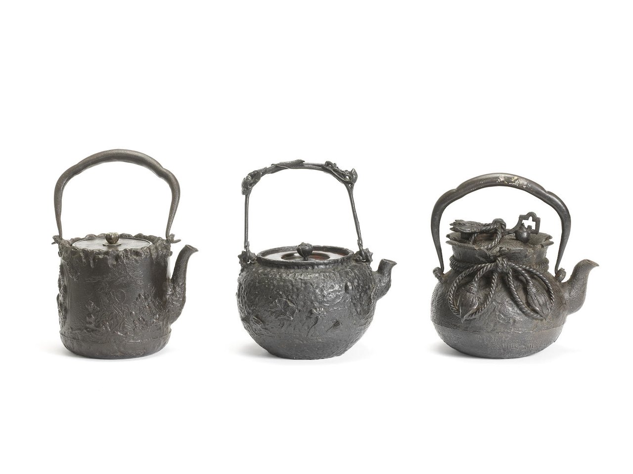 The first of squat globular section, the body textured and cast with lotus flowers growing in a pond, the bronze handle suspended from two ring handles in the form of the heads of mythological creatures, similarly cast with a crab crawling over lotus stalks, the side of the kettle signed in a rectangular reserve Kibundo and stamped on the base with an indecipherable seal, the inside of the mottled cover signed in chiselled cursive characters Ryubundo; the second kettle of cylindrical form, cast in low relief with a Chinese scholar holding a fan and cooling off at the foot of a waterfall, the reverse carved with a five-line Chinese poem in low relief, the lid engraved with a sparrow flying among sprays of chrysanthemum and signed on the inside in chiselled cursive characters Ryubundo; the third kettle in the form of a treasure sack tied at the neck with a tasselled rope, the body cast with fragmented rinzu (textile-weave) patterns, with a fitted iron cover simiarly decorated and surmounted by a finial in the form of an elaborately tied key, the side of the kettle signed with seal Ueda zo,(6)