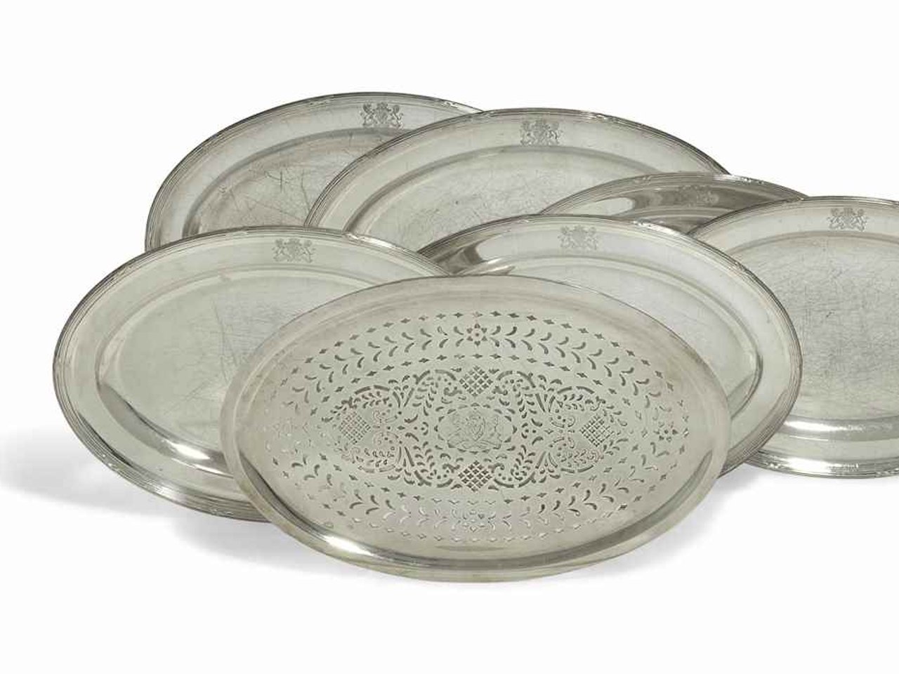 Plain oval and with reed-and-tie borders, each engraved with a coat-of-arms below an earl's coronet, marked underneath, the meat-dishes further engraved with scratchweights '54"16; '56"7; '40"11'; '38"13'; '38"7' and '39"10'
