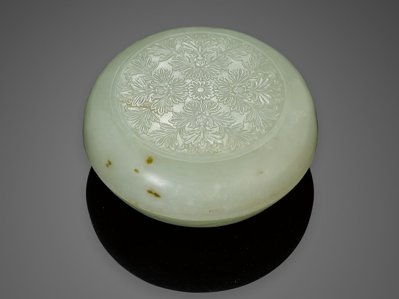 Of compressed globular form with thin walls, carved in crisp low relief across the cover with a central flower head surrounded by four stylized flowering branches, the conforming box raised on a broad foot with upright sides, the recessed base bearing a six-character Qianlong mark carved in standard script and filled with gilt lacquer, the pale gray-green stone showing some cloudy white and isolated russet inclusions.