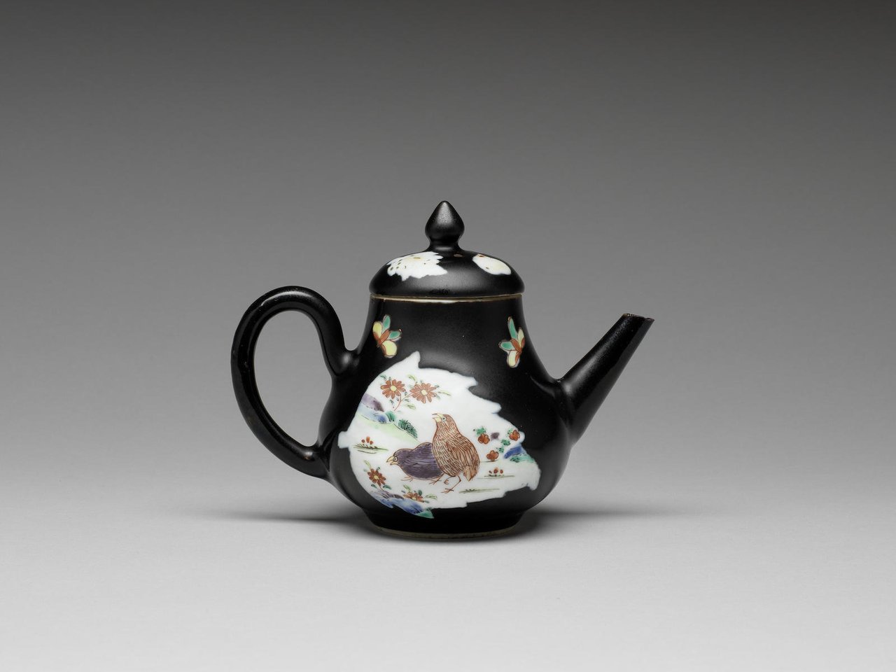 A black-ground polychrome-enamelled teapot and cover by Anonymous