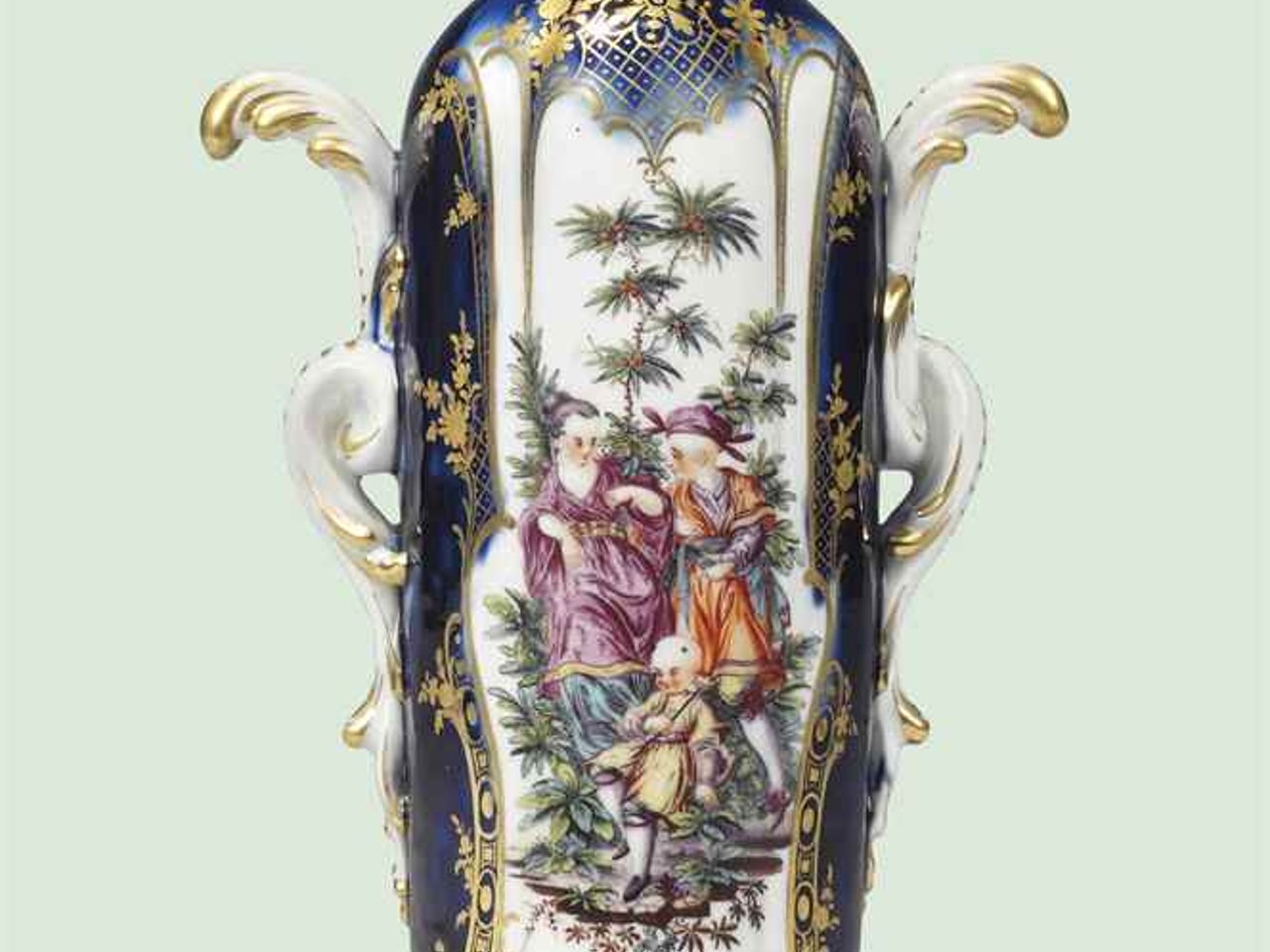 A CHELSEA CHINOISERIE BLUE-GROUND TWO-HANDLED BOTTLE-VASE by Anonymous