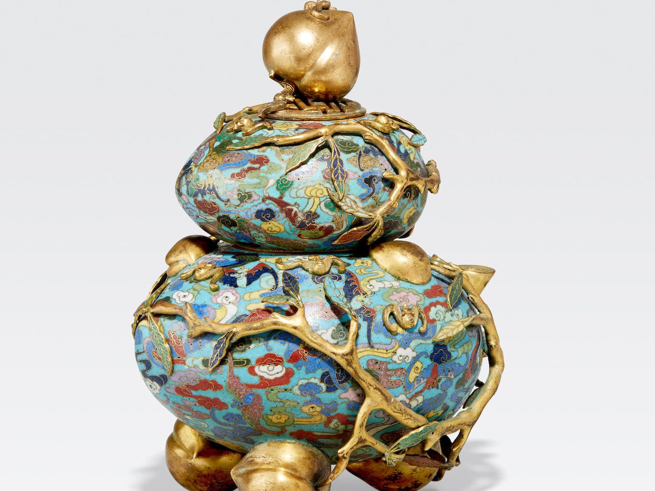 Formed in two tiers as stacked peaches, each enameled with bats and clouds, wreathed with naturalistic gilt bronze branches sprouting enameled leaves and small gilt bronzes peaches, three peaches forming the feet, with small gilt bronze bats applied all over the surface, with a finial formed as a peach resting upon a circular reticulated grill in the shape of a stylized shou character, fashioned in two parts for disassembly, the underside with a gilt four-character Qianlong mark.