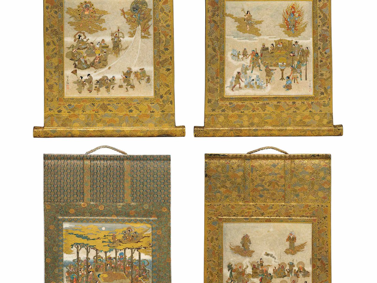 Each designed as a miniature hanging scroll (kakemono) with simulated silk brocade mounts executed in polychrome enamels; three in matching mounts with respective images of The Sixteen Arhats with Gama sennin and Tekkai sennin; Fujin, Raijin, The Seven Gods of Good Fortune (Shichifukujin) and Startled Humans; and Hell Scene: Enma, King of Hell, Presiding over a Skeleton Forced to Look in the Mirror of Past Deeds at His Past Life as a Fisherman Netting Fish, each signed on the obverse Sekko sha with two red seals and signed on the reverse Watanabe Sekko; also with inscription on the reverse of Hell Scene dated Meiji 37 (1904) stating that the plaques commemorate the Russo-Japanese War (1904-5) and with mark of the Hododa workshop and names of additional Hododa artisans and the Shimazu family crest associated with earthenware of the Satsuma type