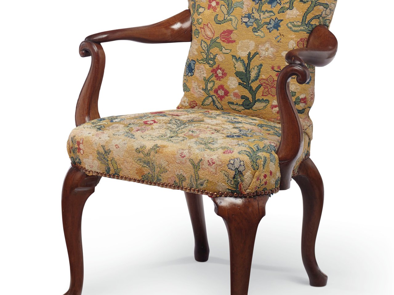 The arched rounded padded back and seat covered in associated 18th century floral needlework, with outswept scrolling arms, on cabriole legs ending in pad feet, elements of framing not examined under upholstery