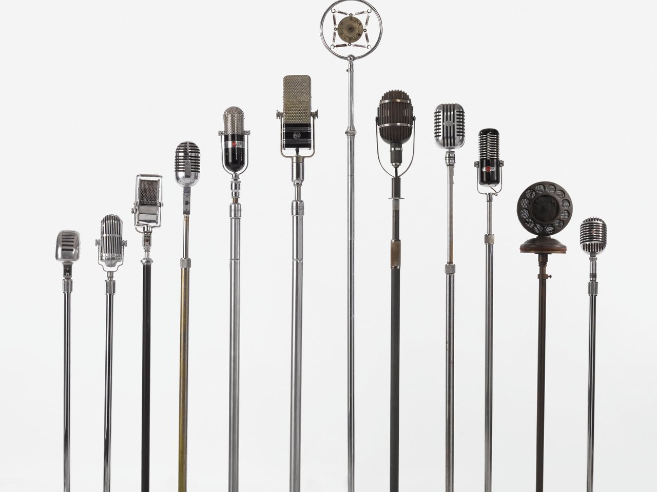 RCA, Model 77B Ribbon Microphone and Floor Stand, designed by John Vassos, 1937, in chromium-plated brass and bakelite