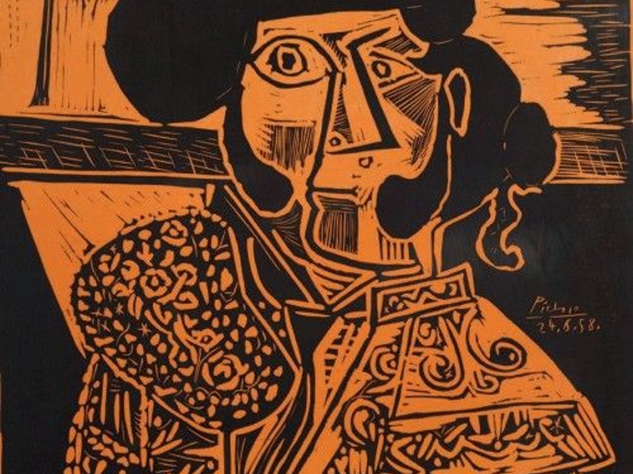 Toros Vallauris 1958. 1958. Linoleum. 643 x 530. [770 x 629]. Bloch 1282 - Czwiklitzer 29 - Baer 1049 B a. Printing in black and orange. Very beautiful proof on watermarked vellum: “Arches”, numbered in graphite and signed in blue pencil, glued directly onto cardboard. Slight offset of the two plates. Slight marginal oxidation. Good margins. Frame