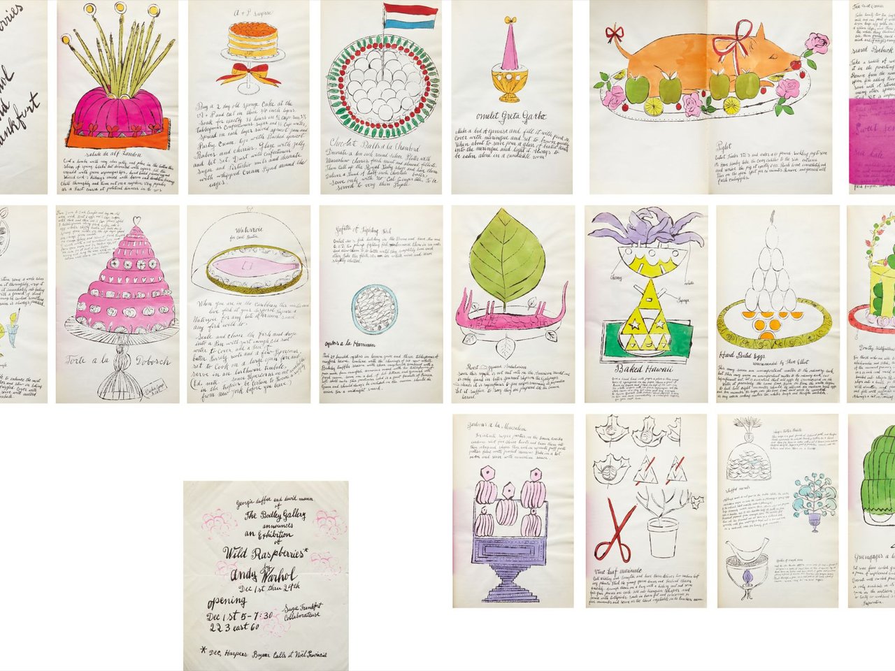 The complete set of 18 offset lithographs, 17 with hand-coloring, one is a double plate, on laid paper, the full sheets, bound (as issued), recipes by Suzie Frankfurt,with original fuchsia tissue overlays,