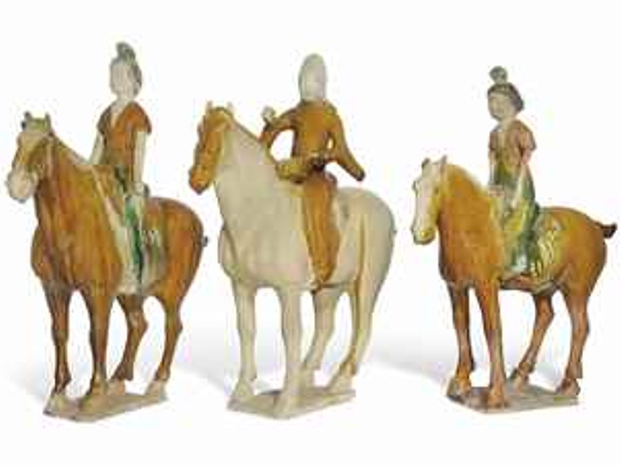 A GROUP OF THREE TANG-STYLE SANCAI-GLAZED POTTERY EQUESTRIAN FIGURES by Anonymous