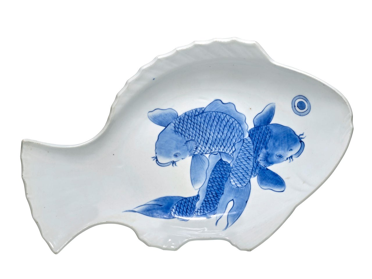 The first molded in the form of a large sea bream decorated on the interior with two swimming carp in underglaze cobalt, the underside painted with floral scrolls and signed Zoshuntei Hisafuku sei; the second, a double gourd bottle decorated with a large phoenix and dragon in gilt and colored enamels, signed on the underside Kinkozan tsukuru
