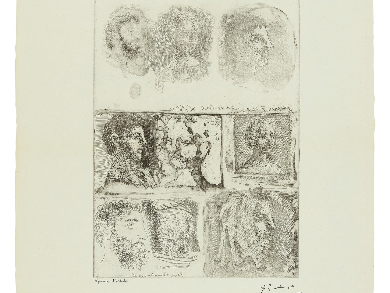 FEUILLE D'ÉTUDES TECHNIQUES. NEUF TÊTES (B. 285; BA. 438) by Pablo Picasso