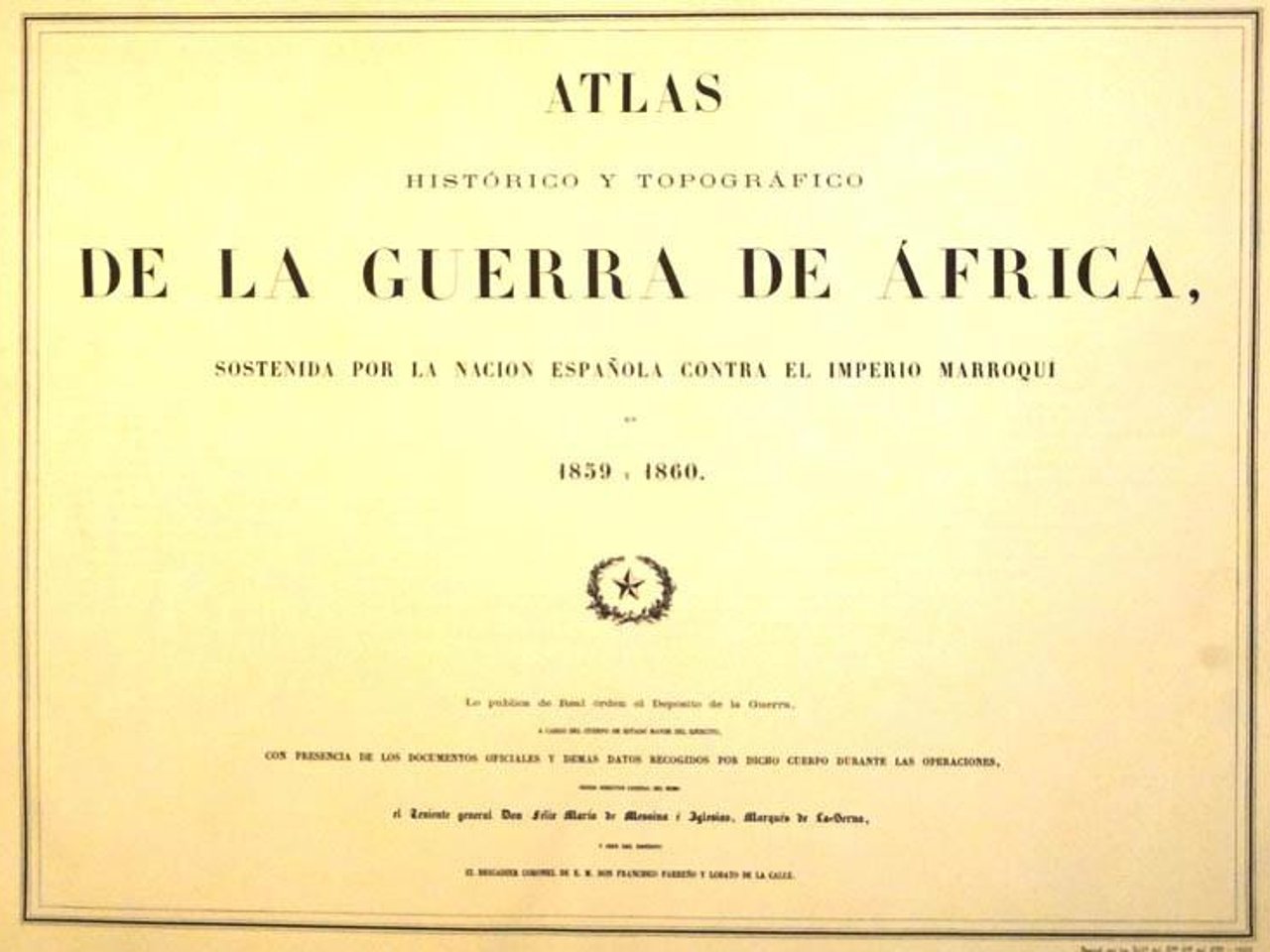 "HISTORICAL AND TOPOGRAPHICAL ATLAS OF THE WAR IN AFRICA, sustained by the Spanish Nation against the Moroccan Empire in 1859 and 1860".- It is published by Royal Order by the War Depository, in charge of the Army General Staff Corps, with the presence of the official documents and other data collected by said body during the operations, being its general director Lieutenant General Félix María de Messina é Iglesias, Marqués de la Serna, and head of the warehouse being brigadier colonel of EM Don Francisco Parreño y Lobato of the street. Play by the Army Geographic Service Workshops, 1960. Three parts: Descriptive documents, Maps and plans (20 sheets, some double) and Panoramas (12 sheets). Large landscape folio (675 x 493 mm.), hol. cloth. Some scratches on the edges, interior in good condition.