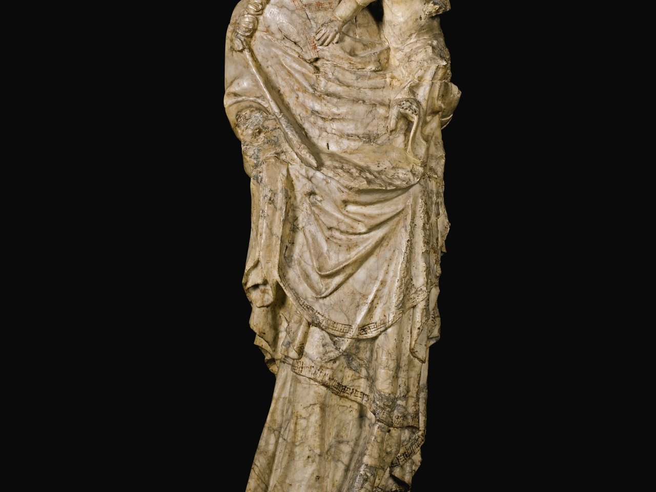partially polychromed alabaster, on a later stone base