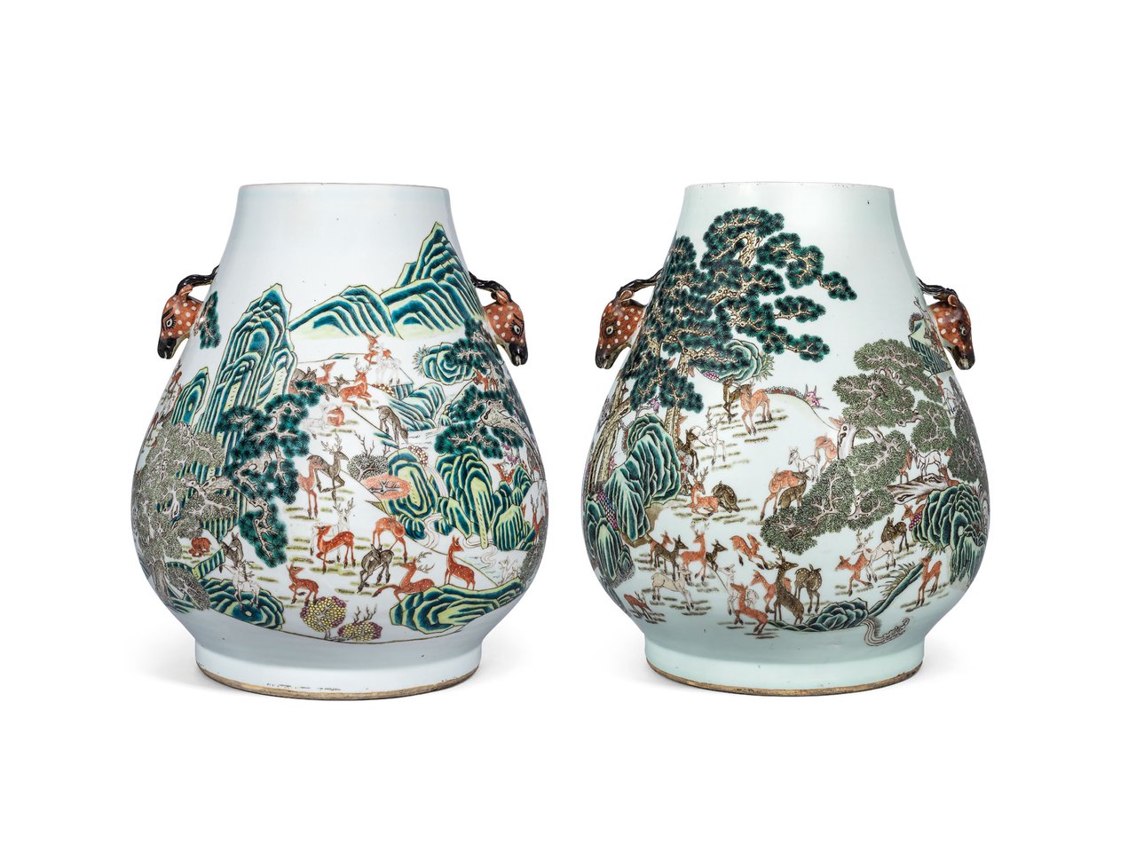 Each vase is decorated with a herd of deer and their young, grazing, gamboling and resting in a lush landscape of pine and peach trees and a meandering stream flowing through blue-shaded rock formations from high mountains in the distance. On the shoulders, each side is flanked with realistically modelled deer-head handles. The base of each is inscribed with an apocryphal Qianlong six-character mark in iron-red.